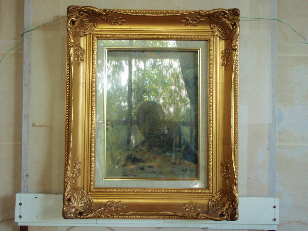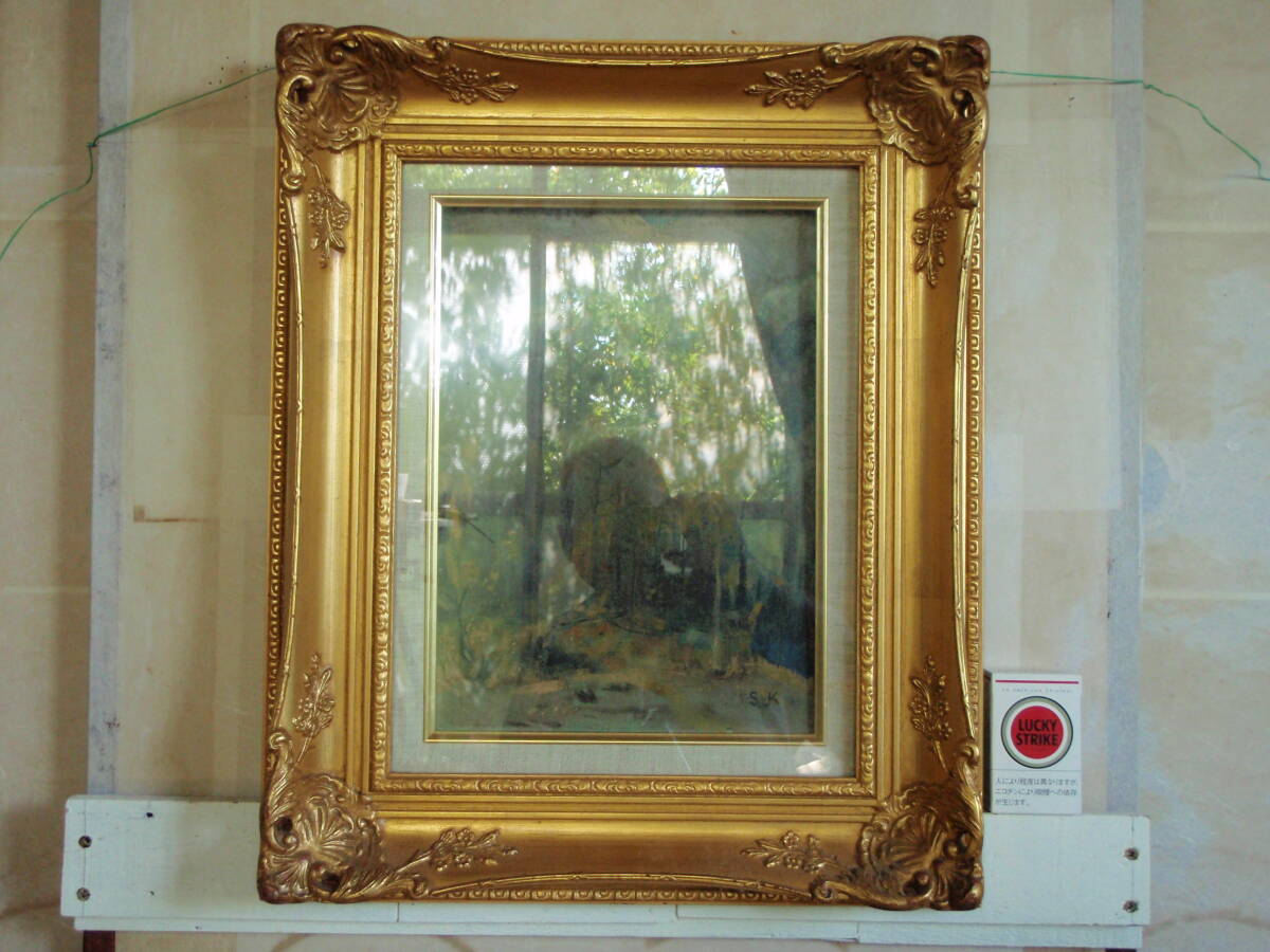 額は経年の汚れ、金の軽い欠落等、裏面水シミ後、額もそれなりにきれいです。