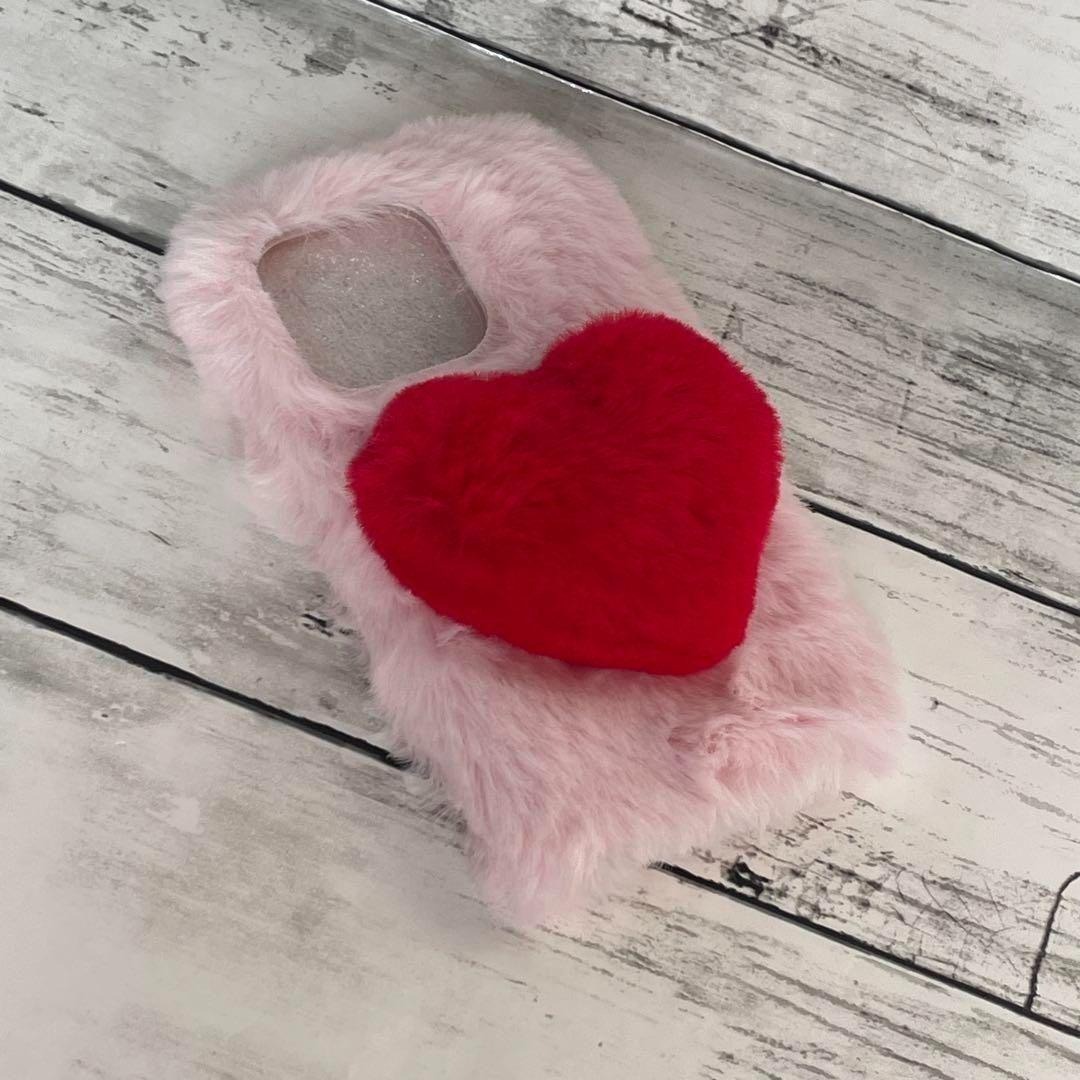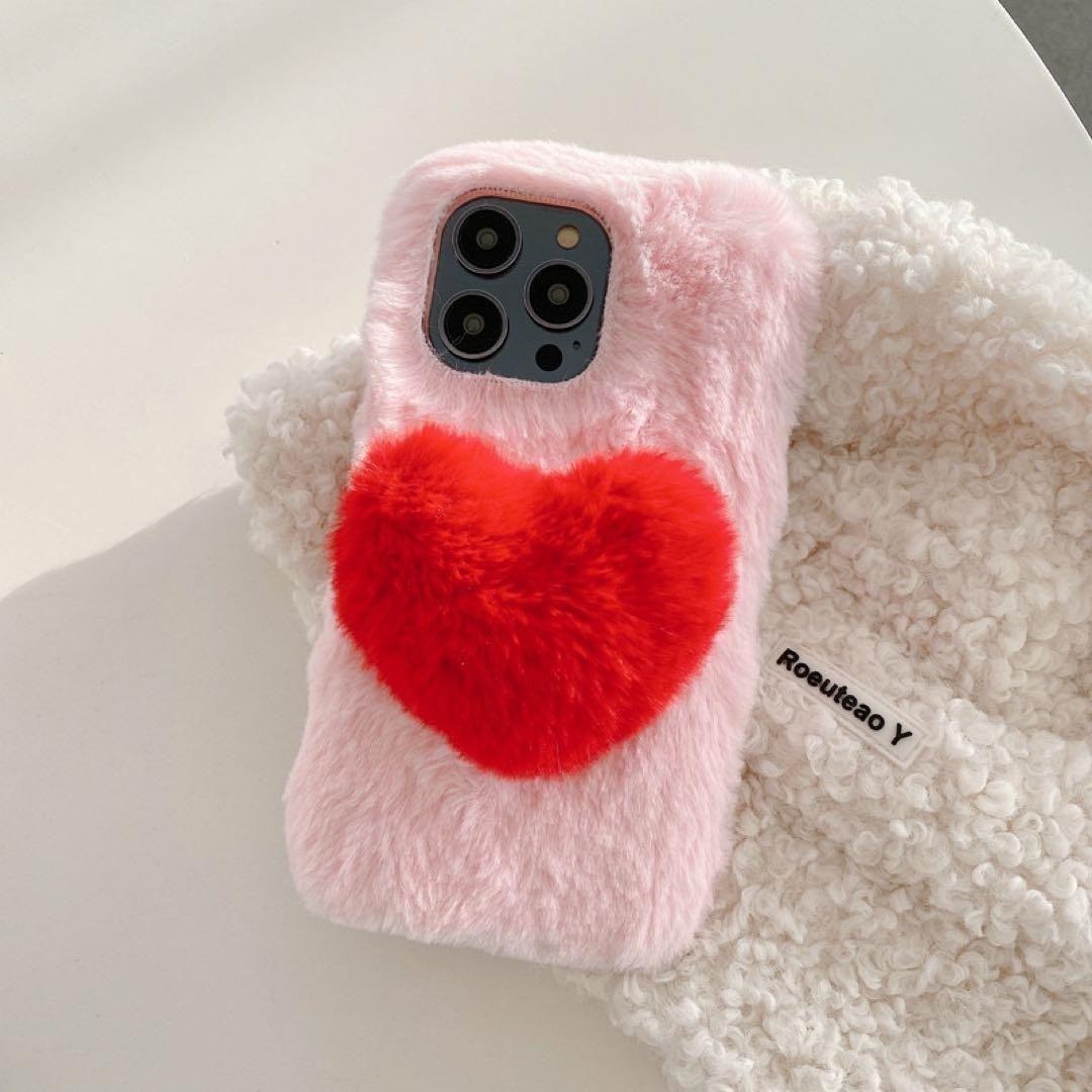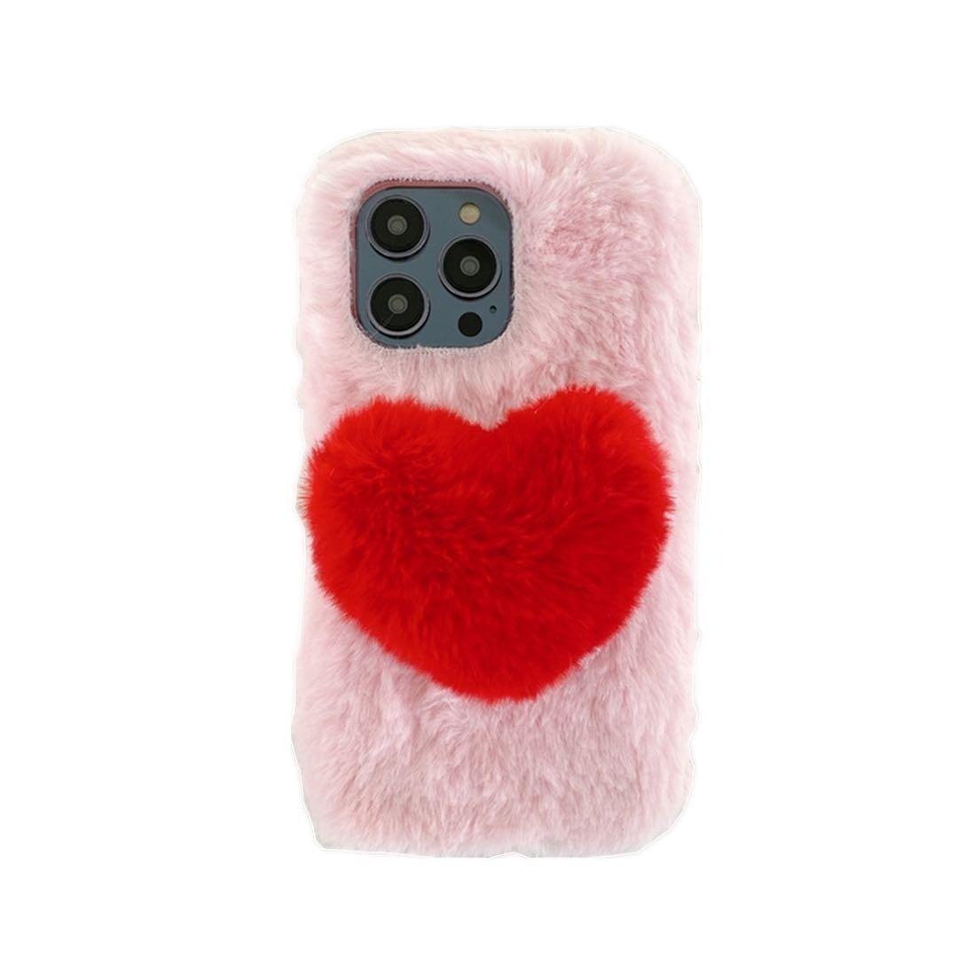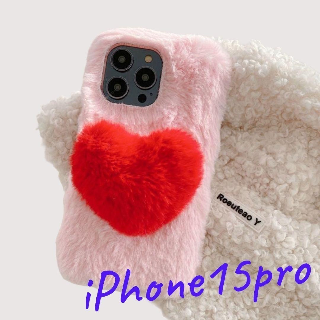 ふわふわ ファー ハート iPhone15Pro ケース ピンク×レッド 冬向けデザイン 可愛い 衝撃吸収 軽量 ギフトにも◎