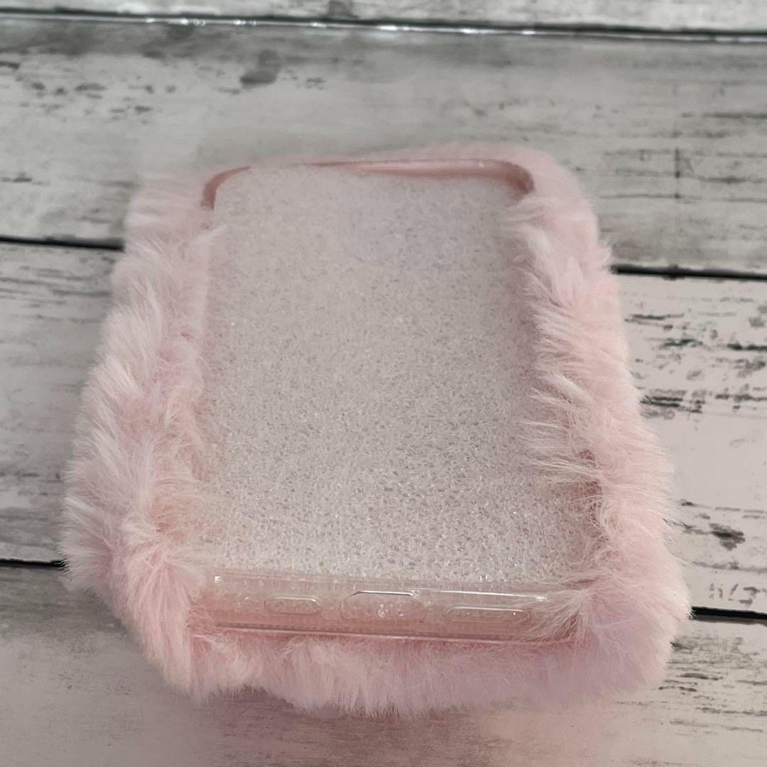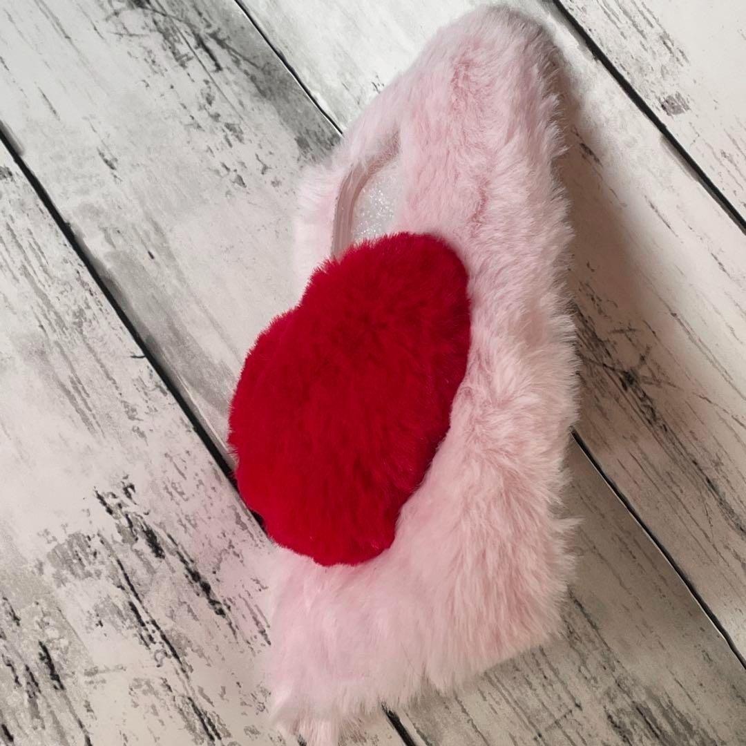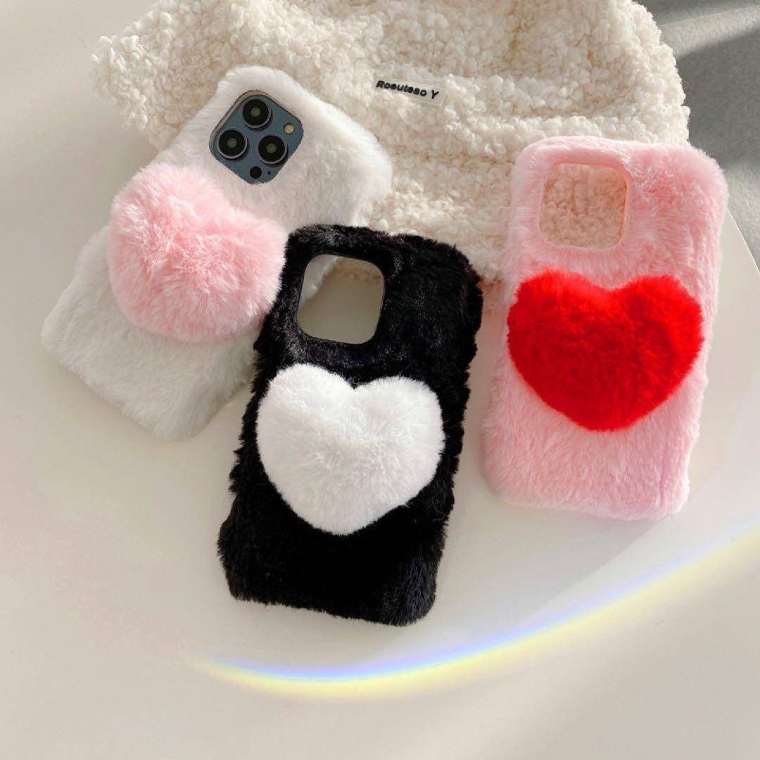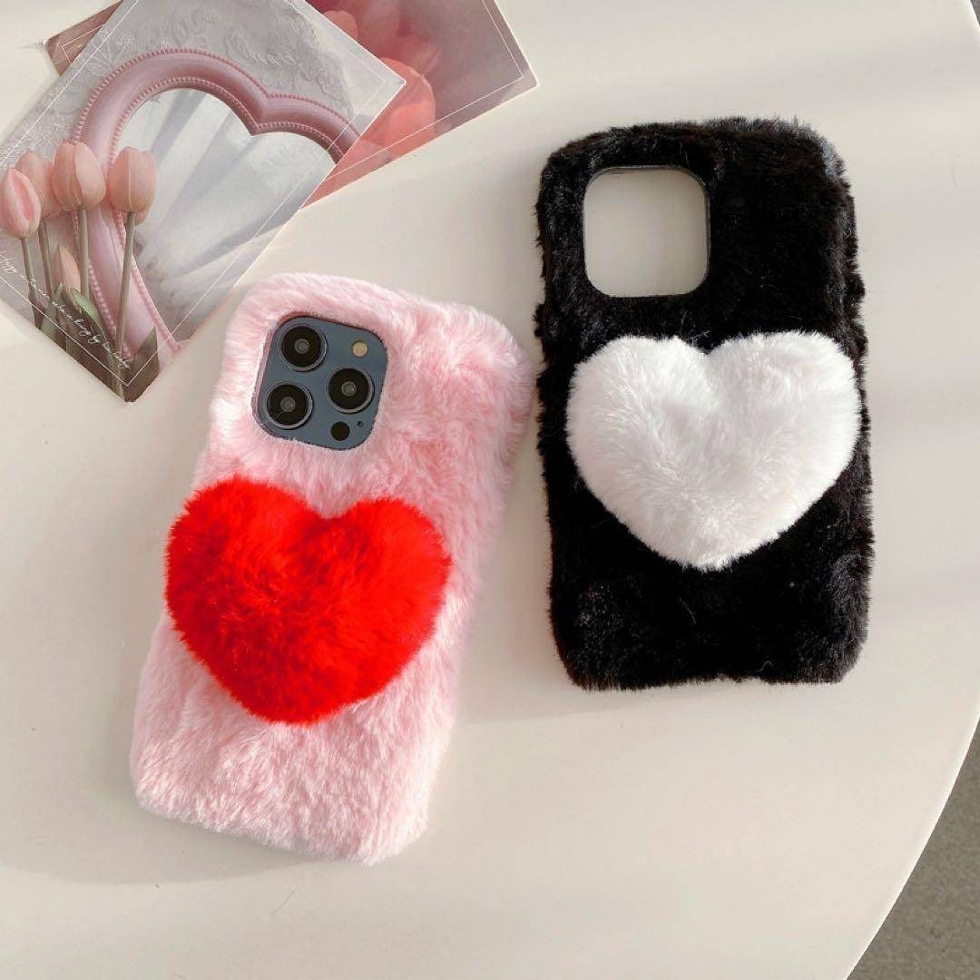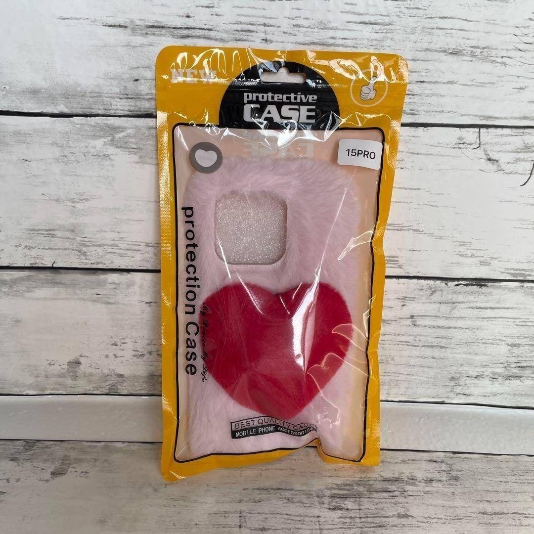 ふわふわ ファー ハート iPhone15Pro ケース ピンク×レッド 冬向けデザイン 可愛い 衝撃吸収 軽量 ギフトにも◎