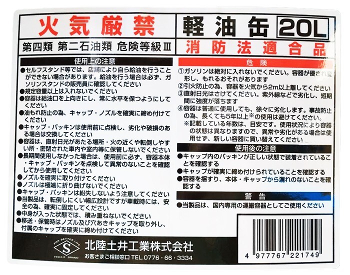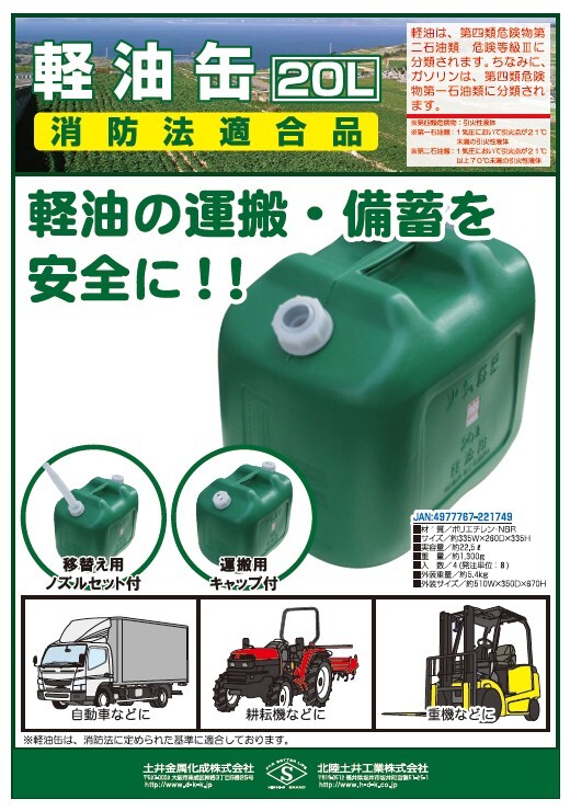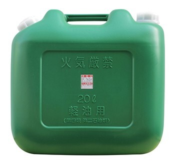消防法適合品。安全な軽油の運搬・備蓄のために!多用途で、お役に立ちます◎自動車、耕耘機、重機などに材質:ポリエチレンサイズ:約 335 × 260 × 335 H容量(L):約 22.5 L重量(kg):約 1,300g本体付属品移替え用ノズルセットキャップ1個(運搬時用)※消防法では危険物(軽油)の容器についての基準が定められています。こちらの軽油缶は消防法『危険物の規制に関する規則』の試験・規則・検査の全てに適合しております。※セルフスタンド等では軽油を自ら給油する事が出来ない場合があります。また、規定により軽油をポリタンクに給油出来ないガソリンスタンドがありますのでご注意下さい。