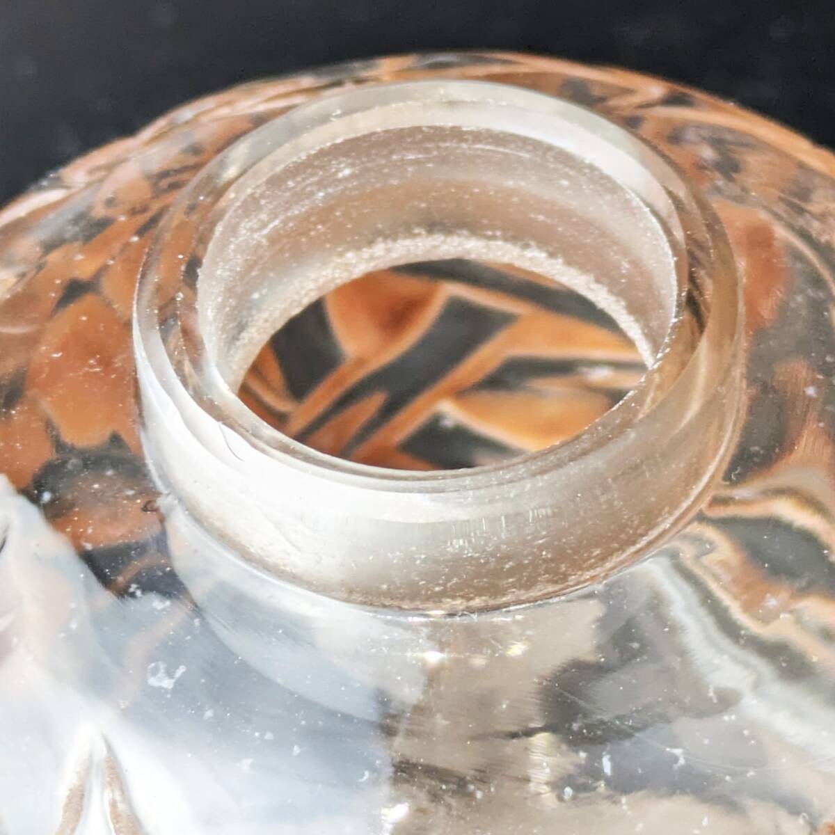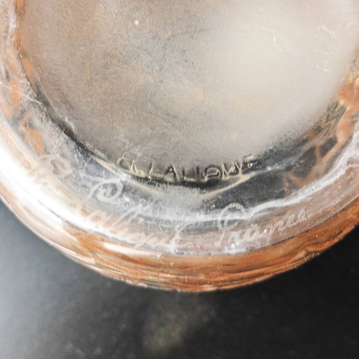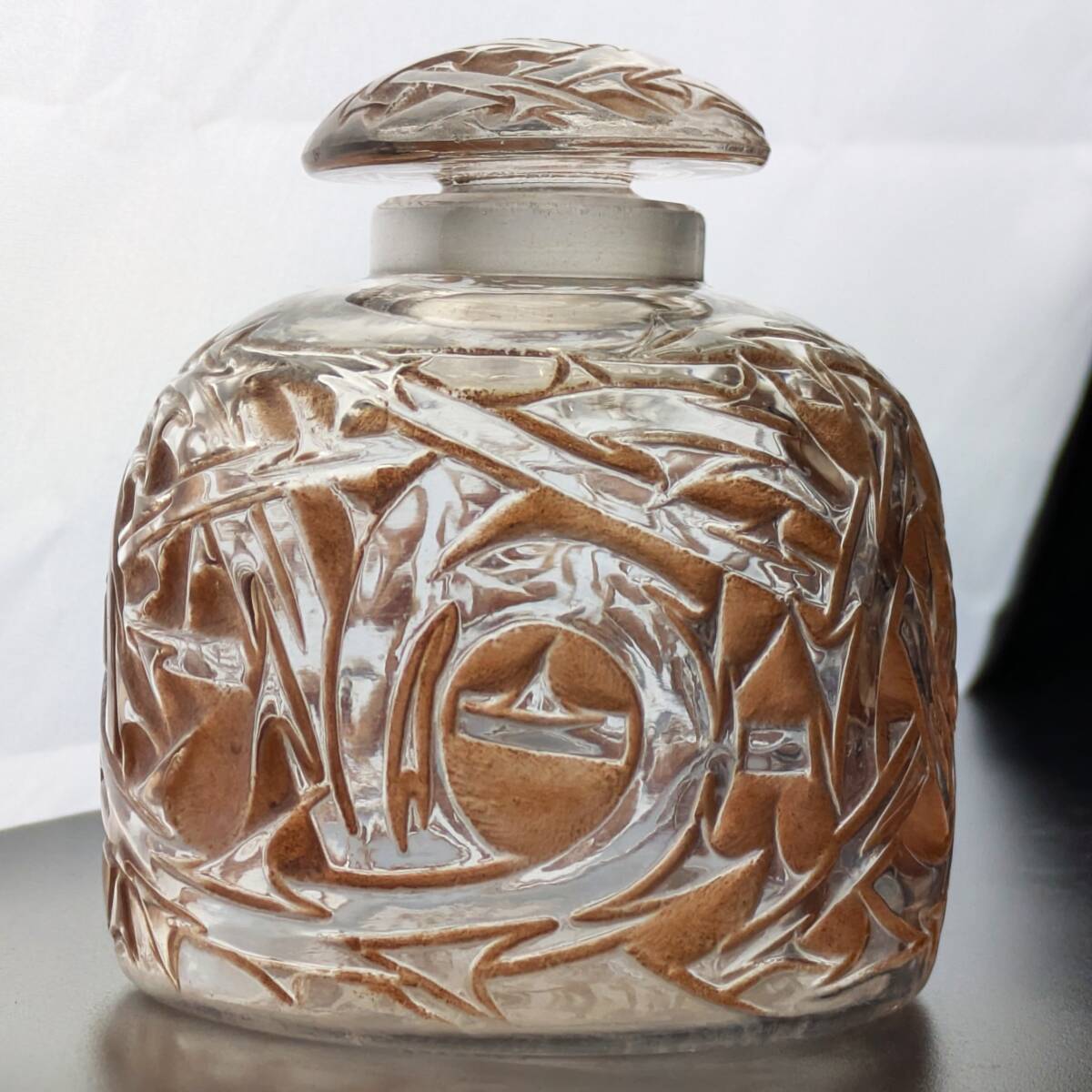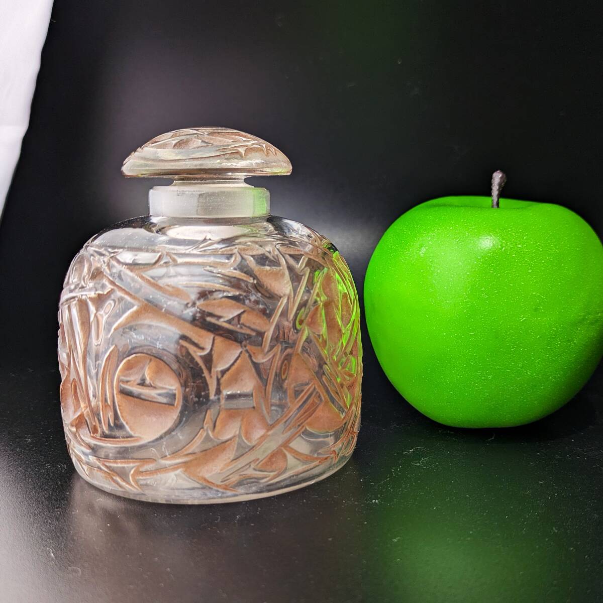 | E1329-57 ◆ぜひ ⇒こちら もご覧ください。 価格のご相談などはプロフィール欄ご覧ください。 ◆お品物◆ ルネ・ラリックによる香水瓶EPINESです。 1920年代にデザインされた作品で、ラリックの代表的なアール・デコ期の創作のひとつとして知られています。 透明ガラスにサテン仕上げと着色が施され、浮き彫り状の植物模様が繊細かつ立体的に表現されています。 ラリックらしい自然主義とアール・デコ様式が見事に融合した逸品です。 底部には「R. LALIQUE FRANCE」の刻印があります。線刻と陽刻のダブルサインです。 現品の状態について ストッパーに小さな欠けがあります 底面には経年による擦り傷があります パチネは十分に残っており大変美しい状態を保っています。 全体としては特筆すべき傷、割れ、ヒビはなく、アンティーク品として良好なコンディションです。 側面の着色部分に経年変化が見られますが、時代の風合いとして味わい深い雰囲気を残しています。 高さ:約10cm 幅:約8.5cm 本作品はコレクターやラリック愛好家の間でも評価の高いデザインで、存在感のある造形美が魅力です。 エレガントで力強いアール・デコの香りを伝える、貴重なルネ・ラリックのオリジナル作品です。 ぜひこの機会にご検討下さい | ||