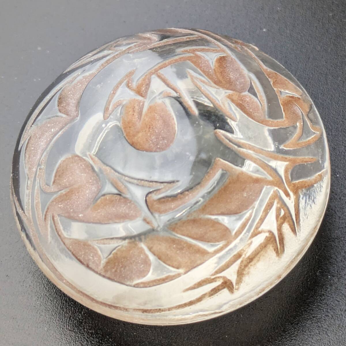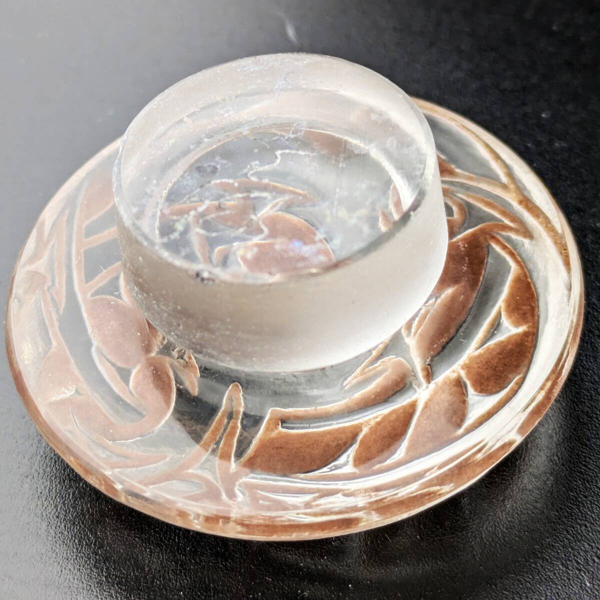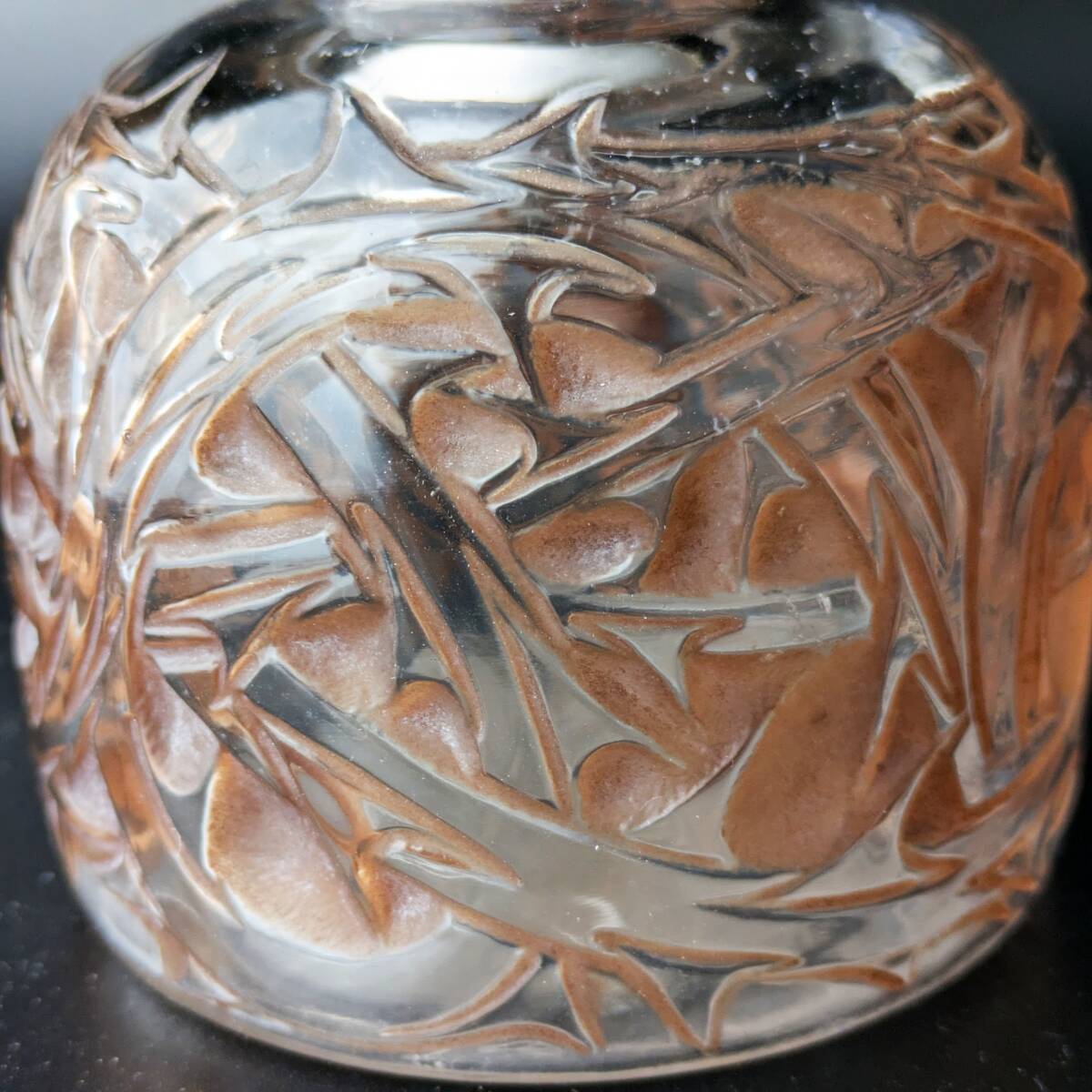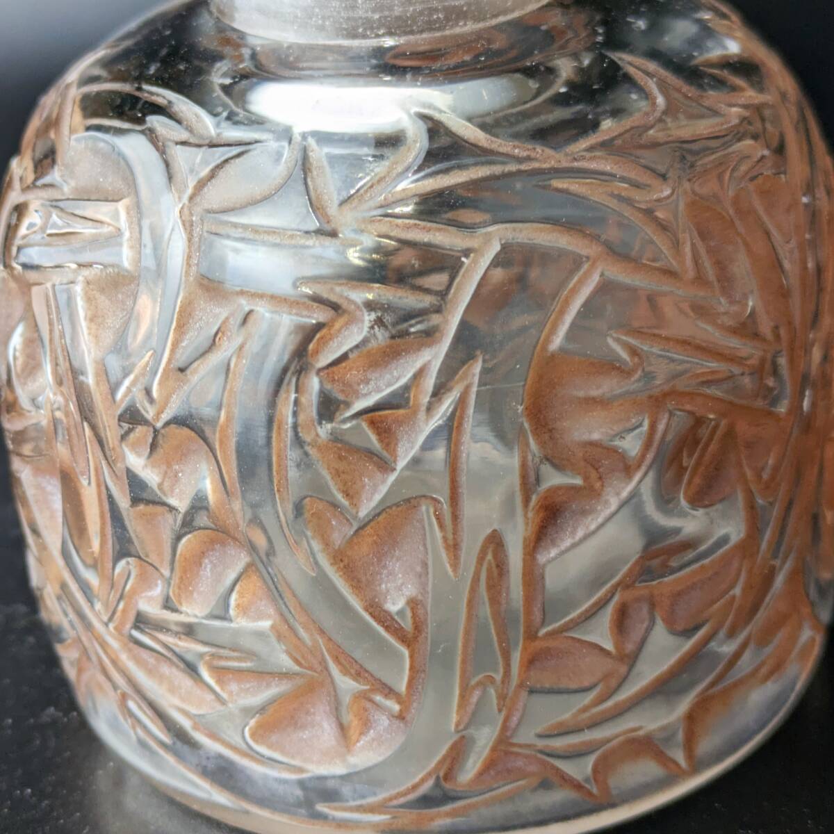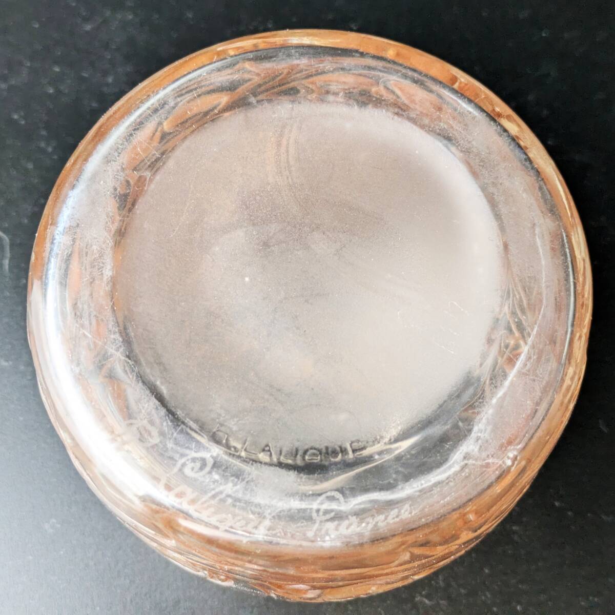 | E1329-57 ◆ぜひ ⇒こちら もご覧ください。 価格のご相談などはプロフィール欄ご覧ください。 ◆お品物◆ ルネ・ラリックによる香水瓶EPINESです。 1920年代にデザインされた作品で、ラリックの代表的なアール・デコ期の創作のひとつとして知られています。 透明ガラスにサテン仕上げと着色が施され、浮き彫り状の植物模様が繊細かつ立体的に表現されています。 ラリックらしい自然主義とアール・デコ様式が見事に融合した逸品です。 底部には「R. LALIQUE FRANCE」の刻印があります。線刻と陽刻のダブルサインです。 現品の状態について ストッパーに小さな欠けがあります 底面には経年による擦り傷があります パチネは十分に残っており大変美しい状態を保っています。 全体としては特筆すべき傷、割れ、ヒビはなく、アンティーク品として良好なコンディションです。 側面の着色部分に経年変化が見られますが、時代の風合いとして味わい深い雰囲気を残しています。 高さ:約10cm 幅:約8.5cm 本作品はコレクターやラリック愛好家の間でも評価の高いデザインで、存在感のある造形美が魅力です。 エレガントで力強いアール・デコの香りを伝える、貴重なルネ・ラリックのオリジナル作品です。 ぜひこの機会にご検討下さい | ||