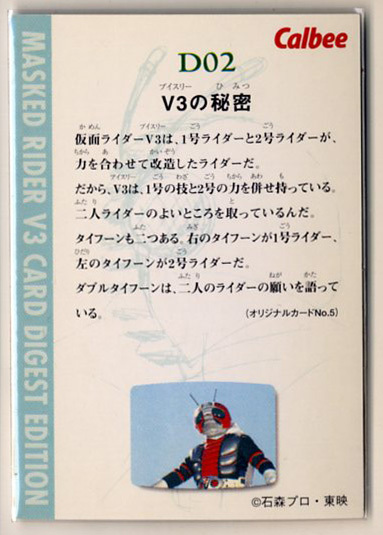 | ◆防水対策 厚紙補強 カルビー 仮面ライダーV3チップスカード(2004 復刻版) D02 V3の秘密 トレカ 即決 | |