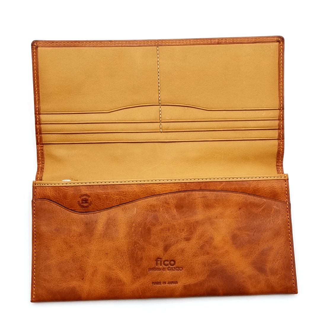 ・送料無料 超美品 フィーコ fico 長財布 財布 二つ折り 0709 01036-19A 0058427-52 WF IC レザー 本革 キップスキン 日本製 茶 ブラウン系 メンズ
