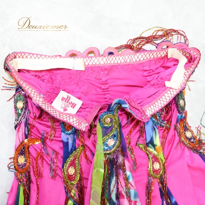 | 【商品名】ベリーダンス オリエンタル衣装 上下セット トップス 【サイズ】表記無し 平置き実測:パッド両端長さ約34cm、アンダーストラップ全長約81cm、 アンダーストラップ(ブラ部分を除く)右約23cm 左約25cm ※実測の為、多少の誤差はご容赦願います。 【仕様】 ・伸縮性無し 【品質表示】 表示無し スカート 【サイズ】表記無し 平置き実測:総丈約89cm、ウエスト約39cm、スリット約74cm ※実測の為、多少の誤差はご容赦願います。 【仕様】 ・ウエストファスナー仕様 ・伸縮性無し ・左前スリット有り 【品質表示】 表示無し ------------------------------------ 【ポイント】 ▽Bella ベラ ▽カラフルで鮮やか ▽装飾が豪華で煌びやか ▽トップス スカート アクセサリー セット ------------------------------------ 【撮影時使用トルソー】 種 類:女性用トルソー9号 (一般的に使用されるサイズです) サイズ:肩先~床約135cm(身長約160cm)、肩幅約37cm、バスト約88cm、ウエスト約66cm、ヒップ約89cm |