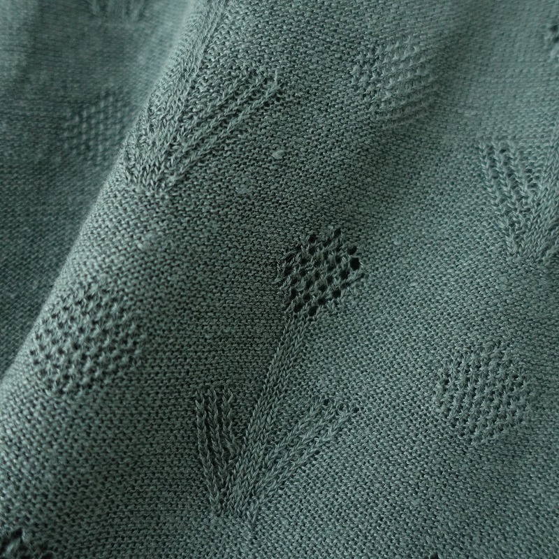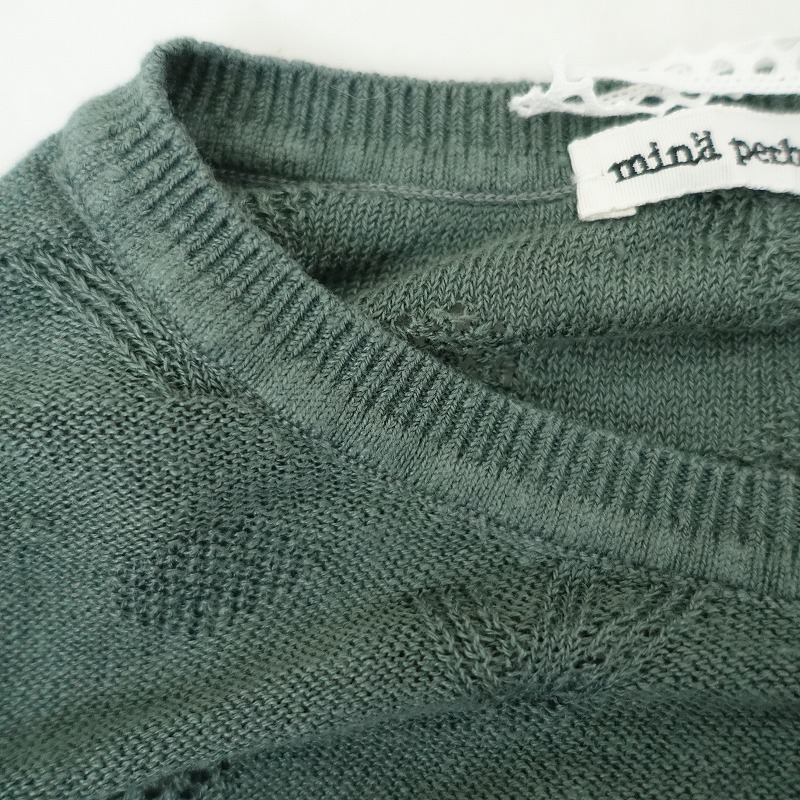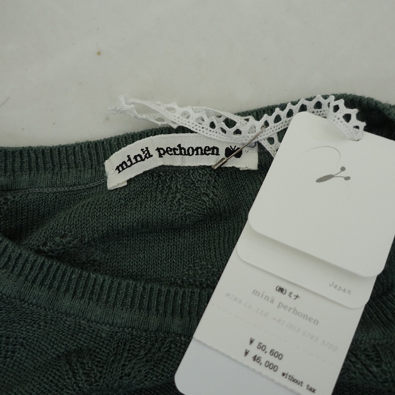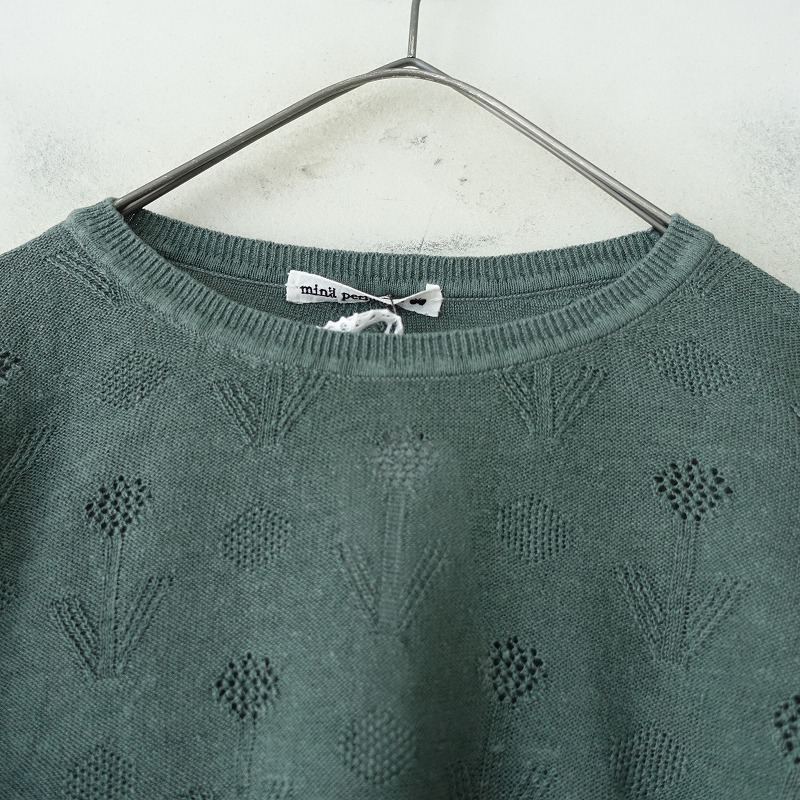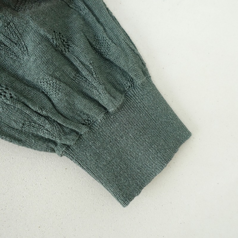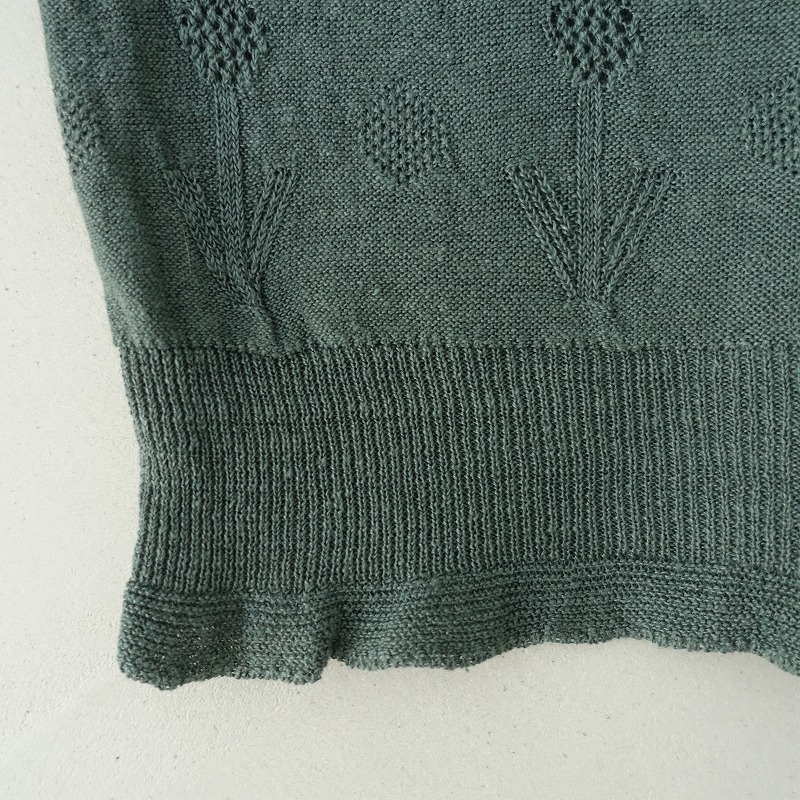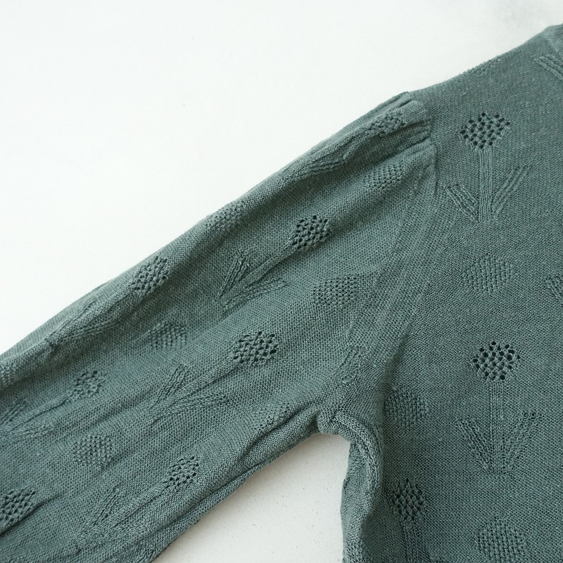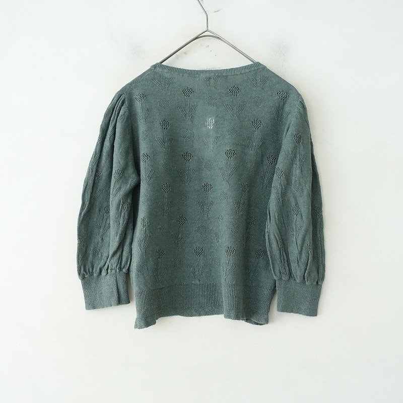 | mina perhonenの「flower tale」リネンニットプルオーバーです。カラーはダークセージグリーンです。サラリとドライな質感の麻ニットで、花模様の透かし編みであしらわれております。袖山と袖口に少しギャザーを寄せたパフスリーブ仕様。定価(メーカー希望小売価格)50,600円の商品です。 |