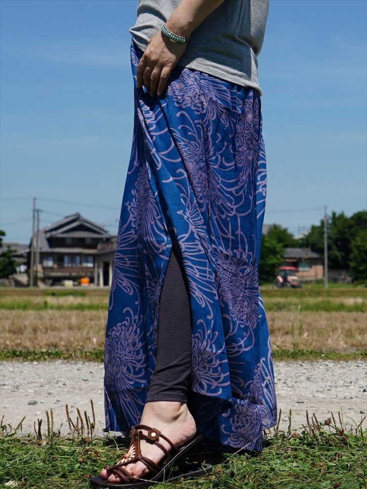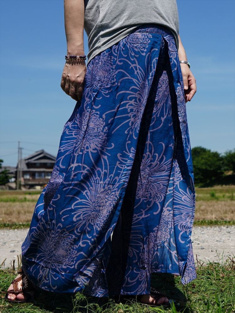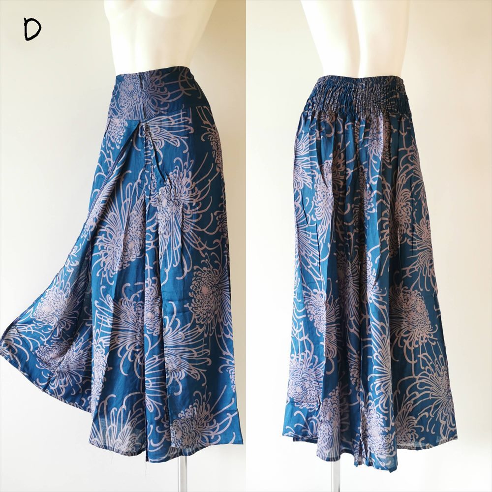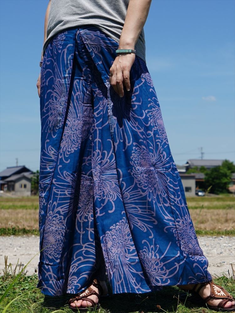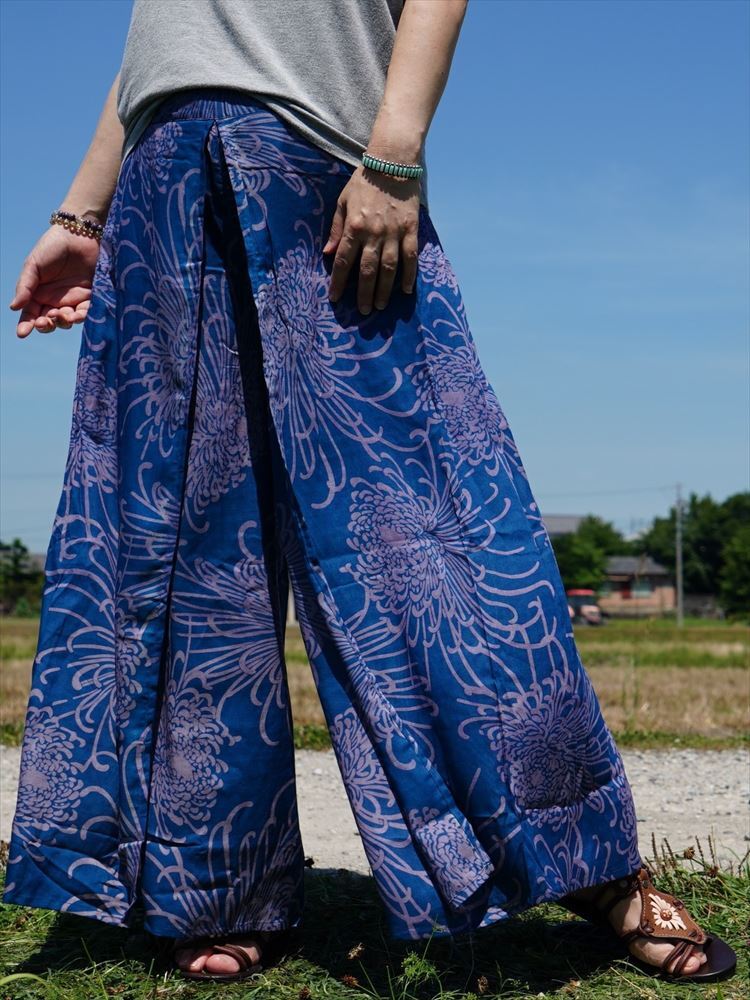 きれいな菊の花と大人カラーの「和×エスニックデザイン」がおしゃれな大人気のラップパンツ♪風通しのいい軽やか生地が足をぐるっと一周巻いたような、ゆったりワイドシルエットの巻き風パンツです。歩くたびひらりと揺れて、さり気なく足元が見えるおしゃれなデザイン。ウエストは後ろ側がシャーリング仕立てになっているので、幅広いサイズ感で、ユニセックス使いもおすすめです◎春~秋までロングシーズン楽しめて、暑い時期でもさらっと気持ちの良いレーヨン素材!季節ごとトップスや足元アレンジしてお楽しみ下さい。