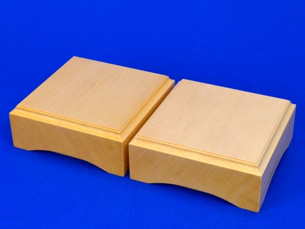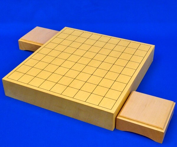 新かや2寸一枚板卓上将棋盤に卓上将棋盤用駒台ヒバ2寸が付いています。卓上将棋盤新かや2寸一枚板は新かや材(北米スプルース材)の一枚板造りの厚みが2寸の卓上将棋盤です。明るい白黄褐色系の色合いです。