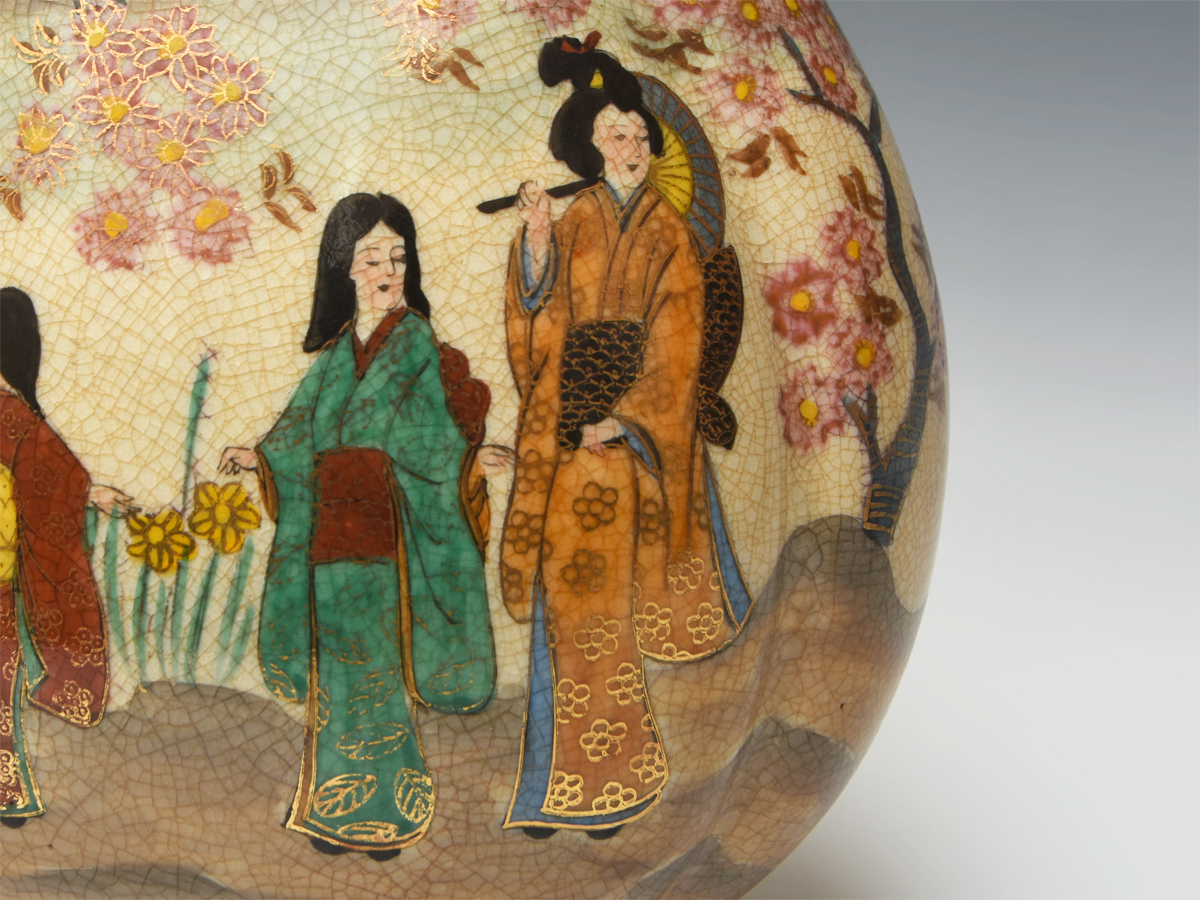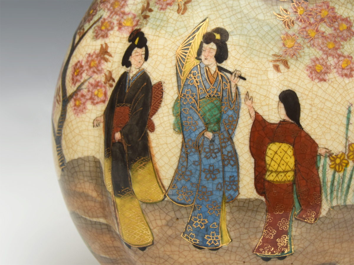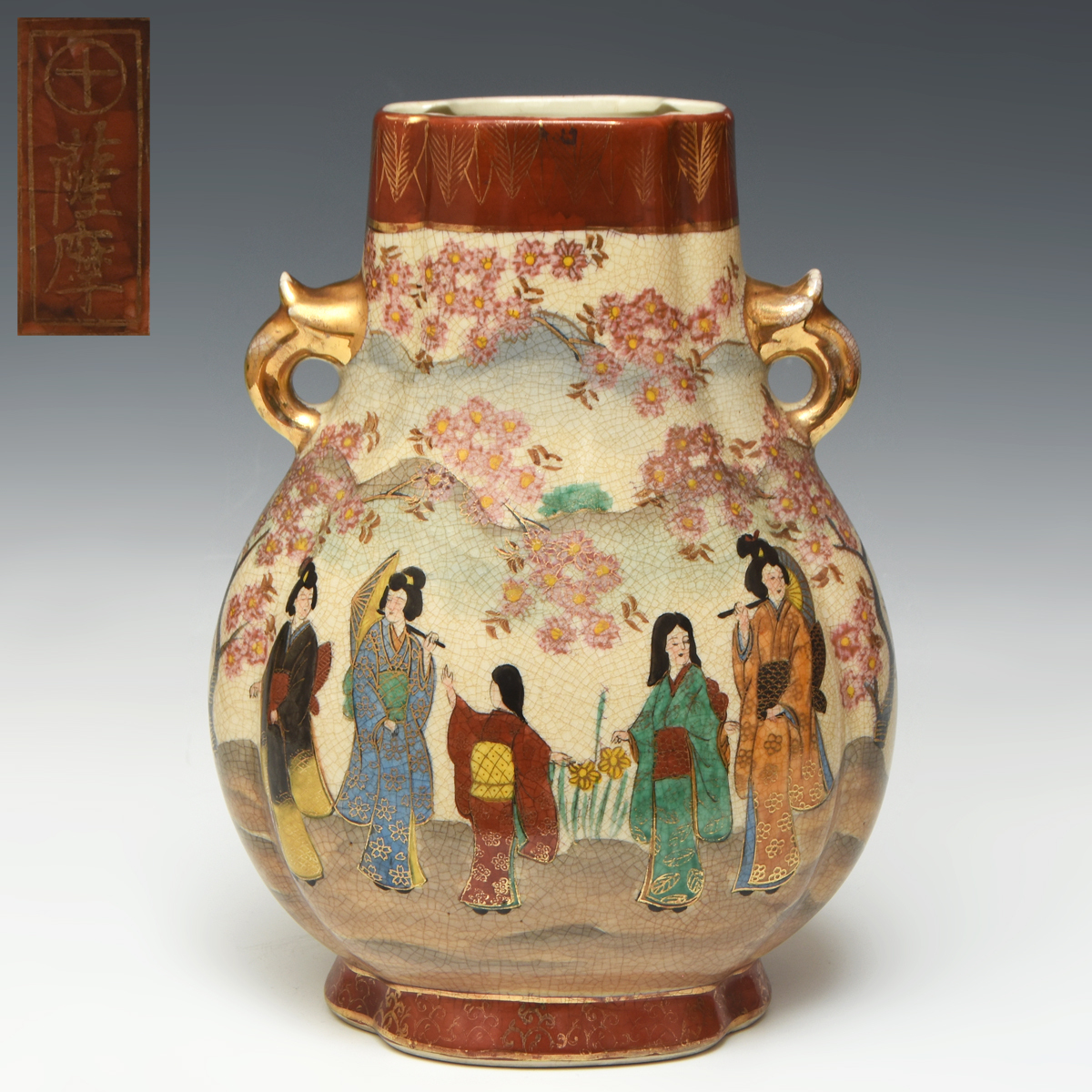 華やかな金彩と細密な筆致が光る薩摩焼の花瓶です。 満開の桜の下に佇む美人たちを描き、色絵の豊かな発色と金彩の輝きが調和しています。 柔らかな貫入を伴う釉調は古雅な趣を添え、観賞用としても格別の存在感を放ちます。 両肩の耳飾りや口縁の装飾も優美で、薩摩焼ならではの品格を感じさせる逸品です。 目立ったダメージ等なくコンディションは良好です。 ※予めご了承の上ご入札お待ちしております。 ※撮影の際に生じた写り込みなどがございます。 ご理解の程よろしくお願い致します。 |