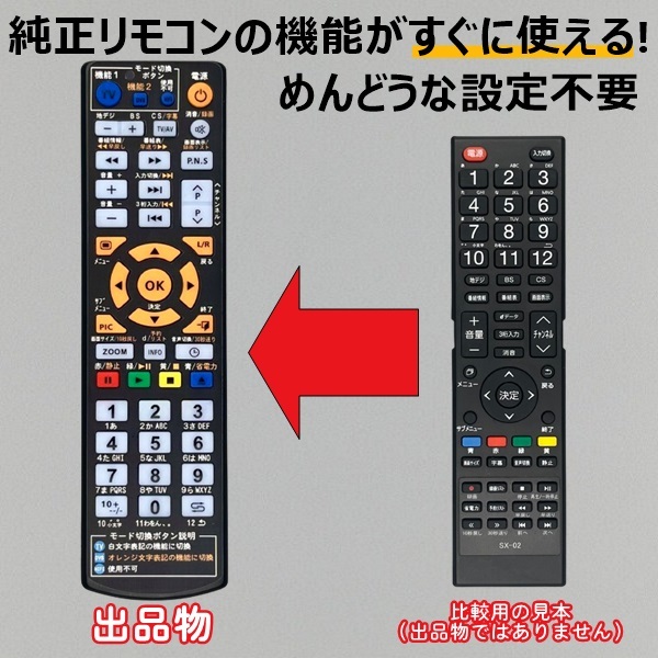 | 【商品名】 WIS ASTEX SX-02 代替リモコン 【対応機種】 AS-03D2402TV AS-03F4302TV AS-23F5002TV AS-403W WI-D3203DW WI-D3203NW WI-D3903SR WI-D3903DWS WI-D3903NWS用 比較画像の右側の純正リモコンが付属する機種に使用出来ます。 上記機種以外については、質問欄よりメーカーと型番をご連絡頂ければ、対応品のご案内をしております。 【商品について】 左側の代替リモコンが出品物になります。右側のリモコンは見本画像です。 タイトル機種のリモコン信号を入力した、設定不要で使える純正品と同等の代替リモコンです。 乾電池は付属しません。別途ご用意下さい。(単4乾電池×2本) 【商品サイズ】 縦18.5cm×横5cm×高さ2.35cm 【発送について】送料無料 迅速発送を心掛けております。土日祝日はお時間を頂く場合ございます。 ポスト投函配達となり、日時指定は出来ません。 | ||