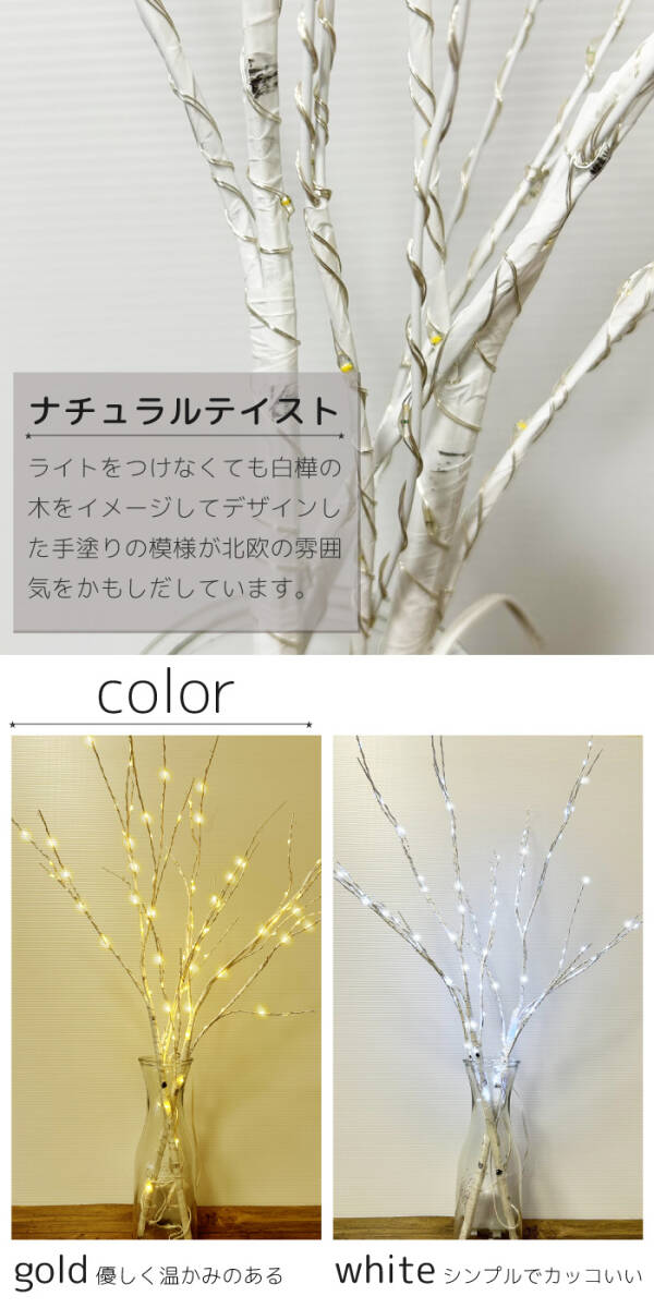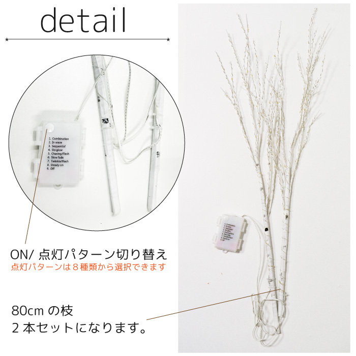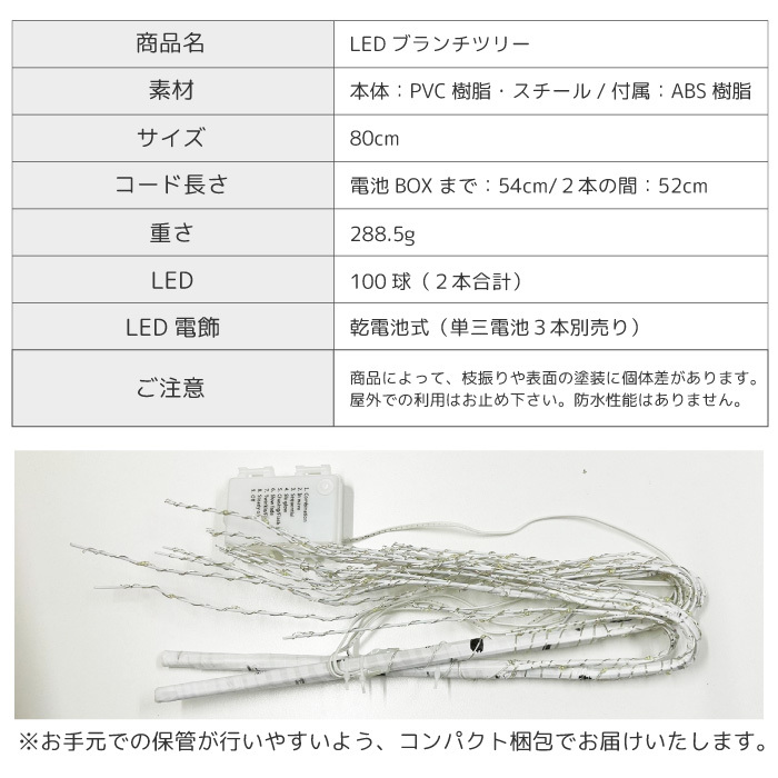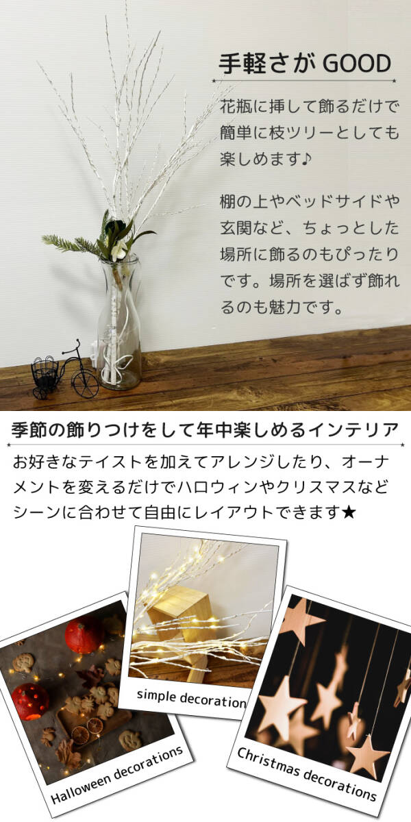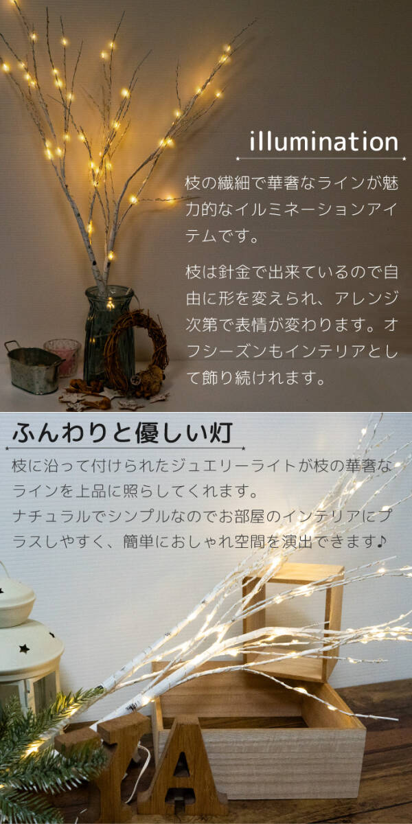 | 【おすすめポイント】 白樺の木をモチーフにした北欧風ブランチツリー★ 枝が繊細で華奢なラインが魅力的なイルミネーションアイテムです。 枝は針金で出来ているので自由に形を変えられ、アレンジ次第で表情が変わります。 オフシーズンでもインテリアとして飾り続けれます。 花瓶などに挿して飾るだけで簡単に枝ツリーとしても楽しめます♪ お好きなテイストを加えたり、オーナメントを変えるだけで ハロウィンやクリスマスなどシーンに合わせて自由にレイアウトできます。 簡単に取り入れられるおしゃれなインテリアアイテムです♪ ■サイズ:135×95cm 【商品情報】 ■新品 ■素材:本体:PVC樹脂・スチール/付属:ABS樹脂 ■セット内容:2本セット ■サイズ:大80cm ■カラー:ホワイト ■LED:100球(2本合計) ■LED電飾:乾電池式(単三電池3本別売り) |