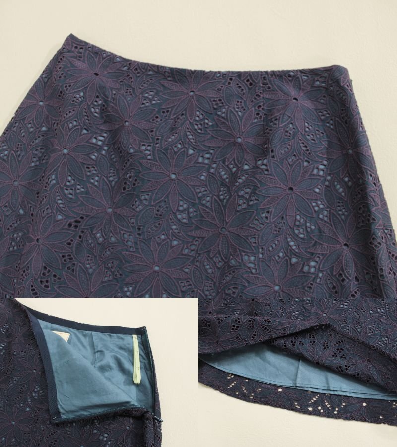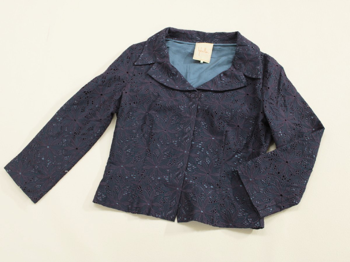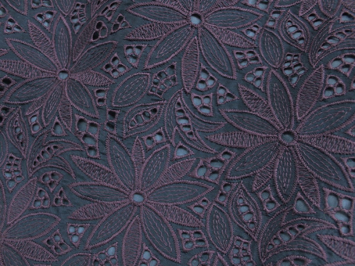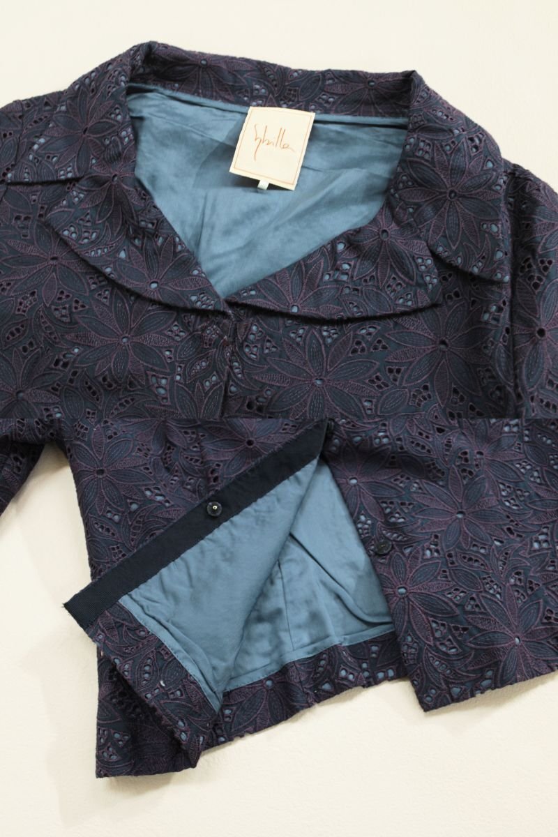 シルク混コットン生地に繊細な刺繍が施されており、裏地の紺色が覗くデザインです。