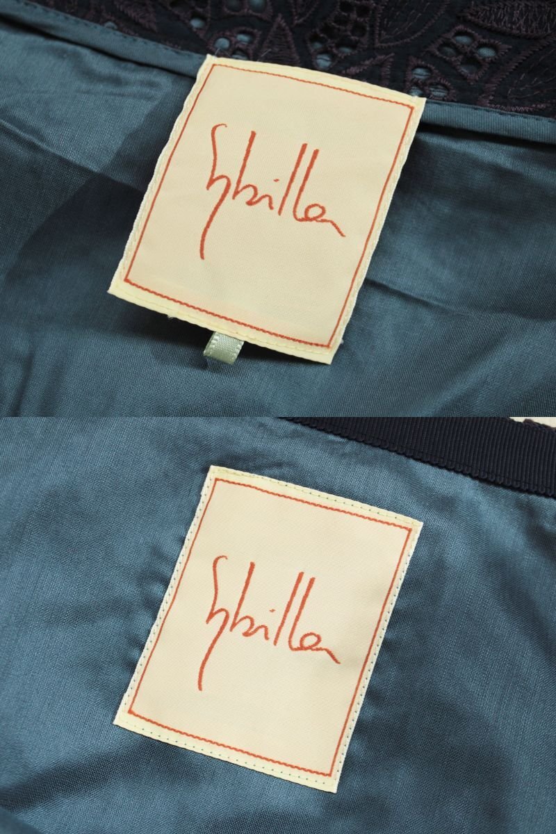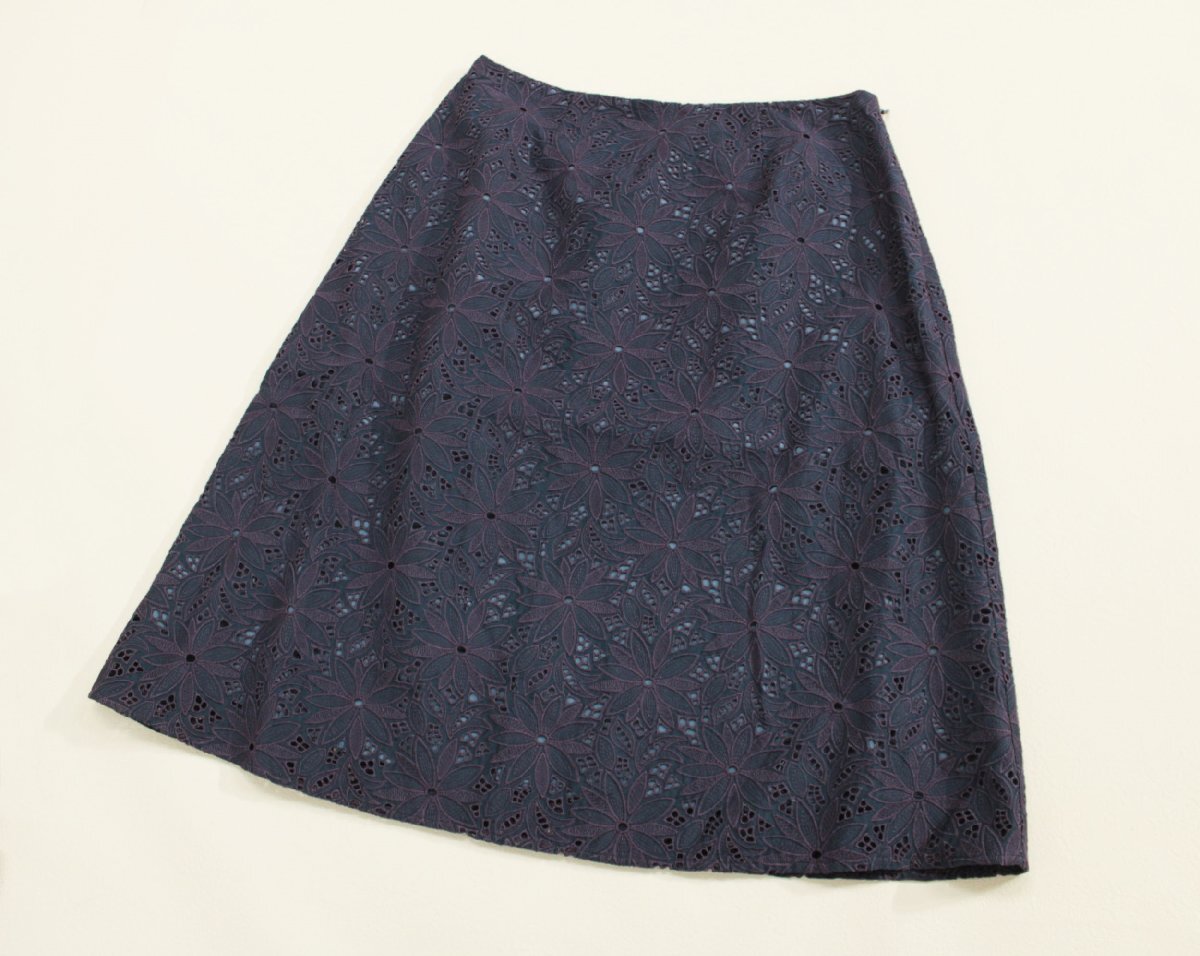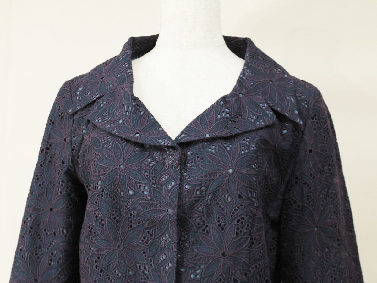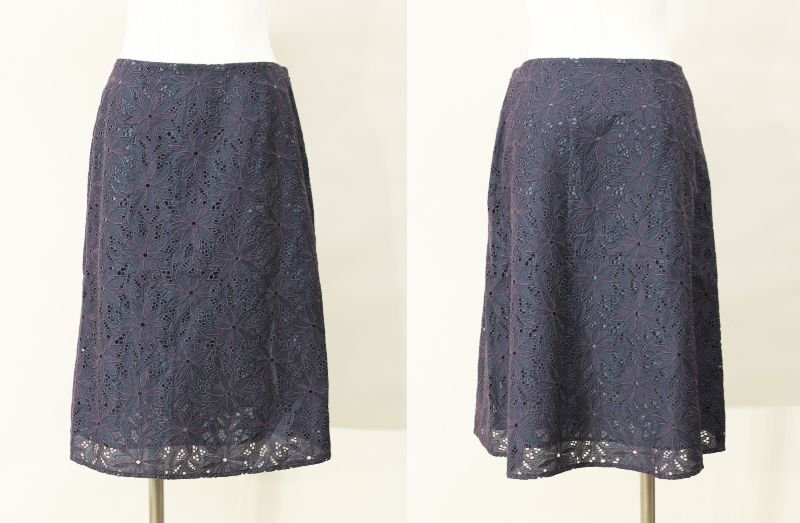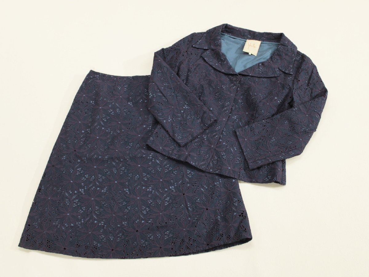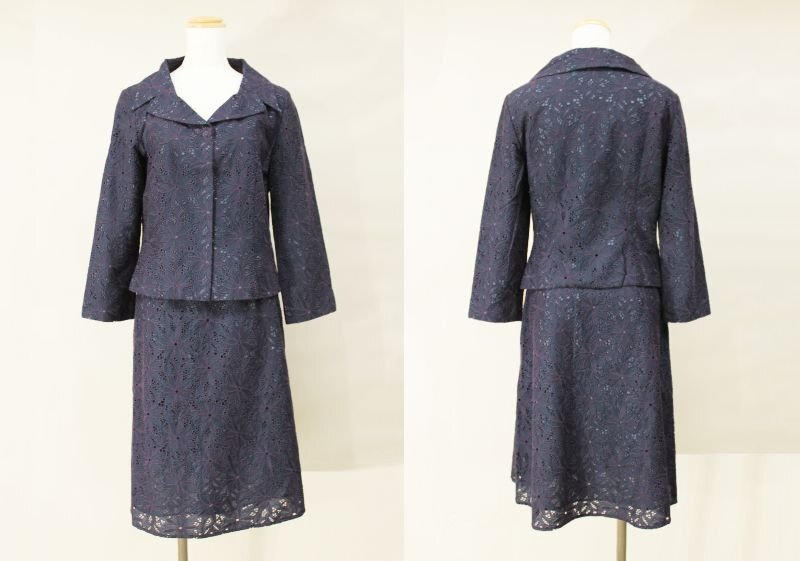 美品シビラ コットンシルクカットワークレース刺繍ジャケット&スカートセットアップスーツL紺紫an263