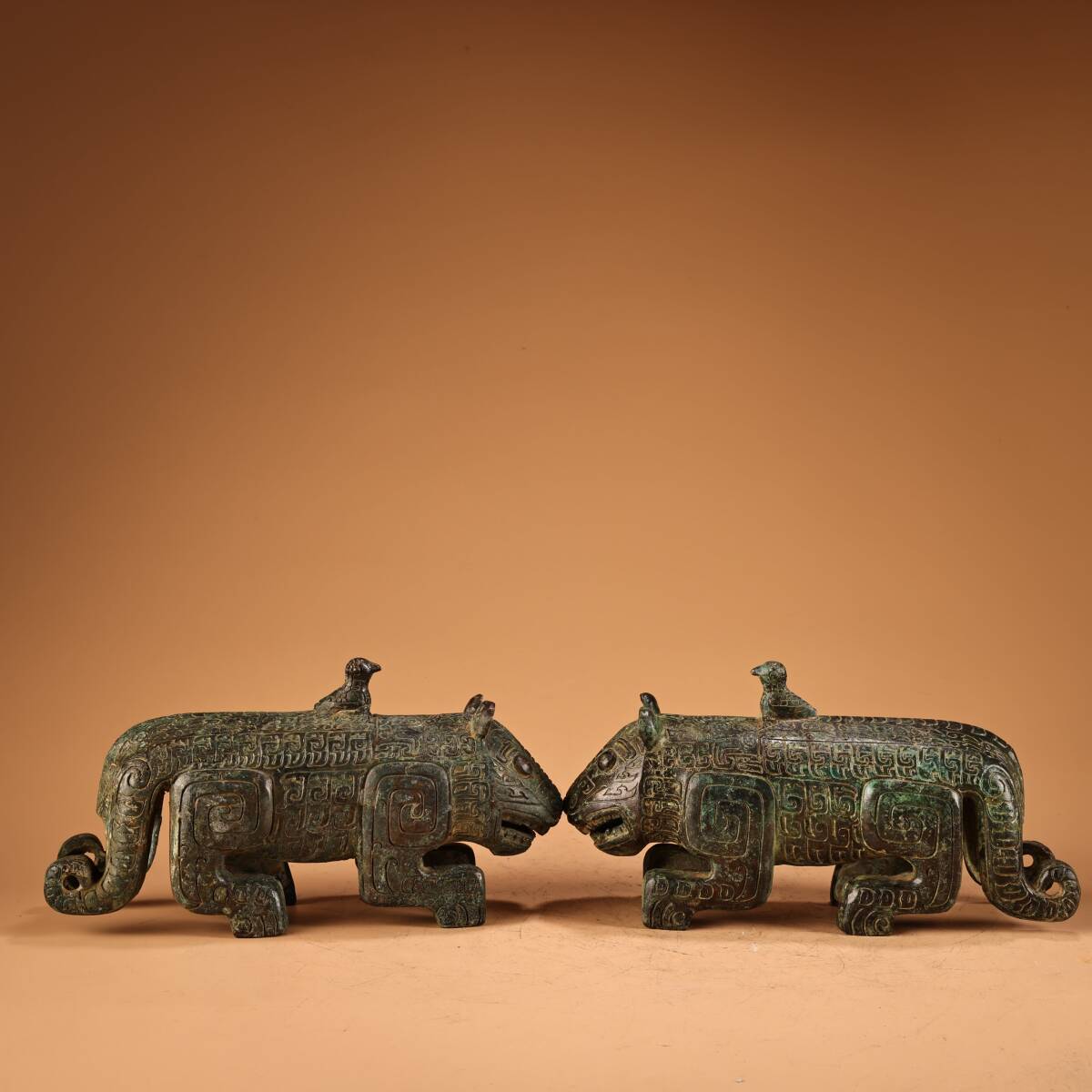 人間国宝KM0662:A 中国骨董 銅製品 【2つの尾を持つ一対の青銅の虎とうずくまっている鳥】 中国古美術 置物 工芸品 旧蔵 珍品 工芸品