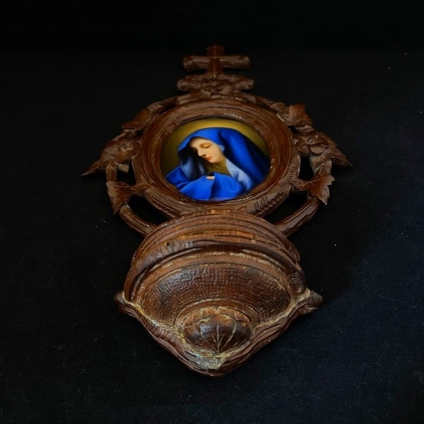 | 19世紀フランス。聖母マリアのリモージュの陶板画を中心に据えた聖水盤です。 描かれた聖母像は、17世紀イタリアの画家カルロ・ドルチ(Carlo Dolci)の「悲しみの聖母」をもとにしたもので、深い青のヴェールに包まれた静かな祈りの姿が印象的です。また陶板は艶やかで発色も美しく、柔らかな陰影が清らかな宗教美をよく伝えています。 木製フレームは蔦葉と花のモチーフを組み合わせた手彫装飾で、上部には十字架、下部には小さな聖水盤を備えています。 長い歳月を経て、アンティークならではの縁の一部に小さなカケ、聖水盤部分に補修跡が見られますが、全体の雰囲気を損ねるほどではなく、時代を経た木肌の深い色合いとともに、古い信仰具ならではの温もりを感じさせます。詳細は画像にてご確認ご判断ください。 聖母マリア崇敬が高まった19世紀後半のフランスの、家庭礼拝用の静謐で美しい一品です。 年代:19世紀後期 国:フランス 素材:陶板・木彫 サイズ:高約26cm 幅約14.5cm *以下のご注意を必ずご確認、ご納得の上ご入札ください。 ■ ご落札後2日以内のご決済、到着後即日受け取り連絡が可能な方のみご入札ください。 ■ ご入札後のキャンセルやご落札後の返品はお受けできません。 ■ アンティークです新品のようなコンディションをお求めの方は ご遠慮ください。 ■ モニター環境等により画像と現物の色合いに若干の違いが出る場合もございます。 ■ 土日祝日はご質問の回答、発送対応などはできません。 ■ 自己紹介欄は必ずご一読ください。 | |||