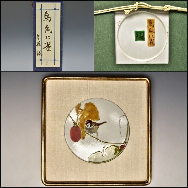 U08859 東京芸大 高橋誠 色絵磁器 陶額 烏瓜に雀 共箱 /G305