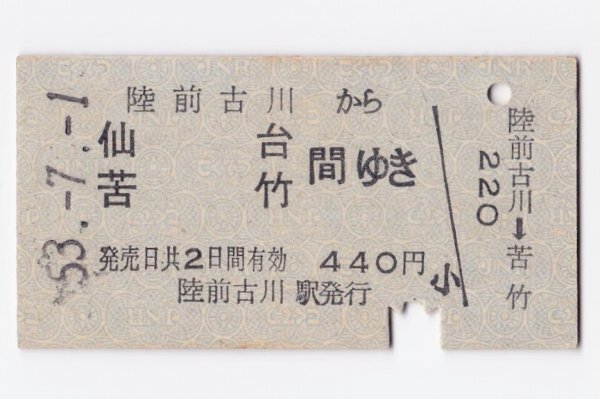 ●国鉄●陸羽東線【 陸前古川から仙台 苦竹 間ゆき 440円 】A型券 昭和53年 陸前古川駅発行【39498】☆改称駅☆