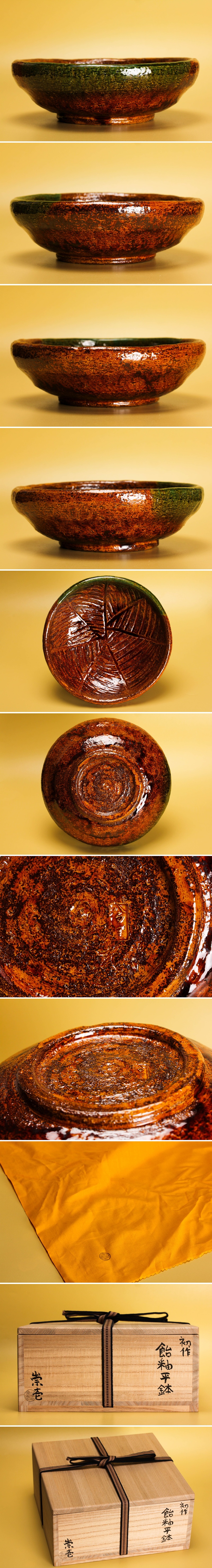 中村崇壱 八事窯 初作 飴釉平鉢 共箱 共布 本物保証 (父:五代 中村道年)