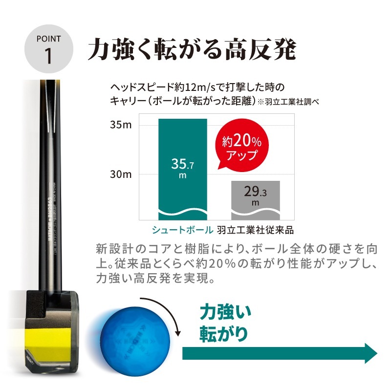 重めの高反発、ハタチ従来品より、距離約20%のアップ