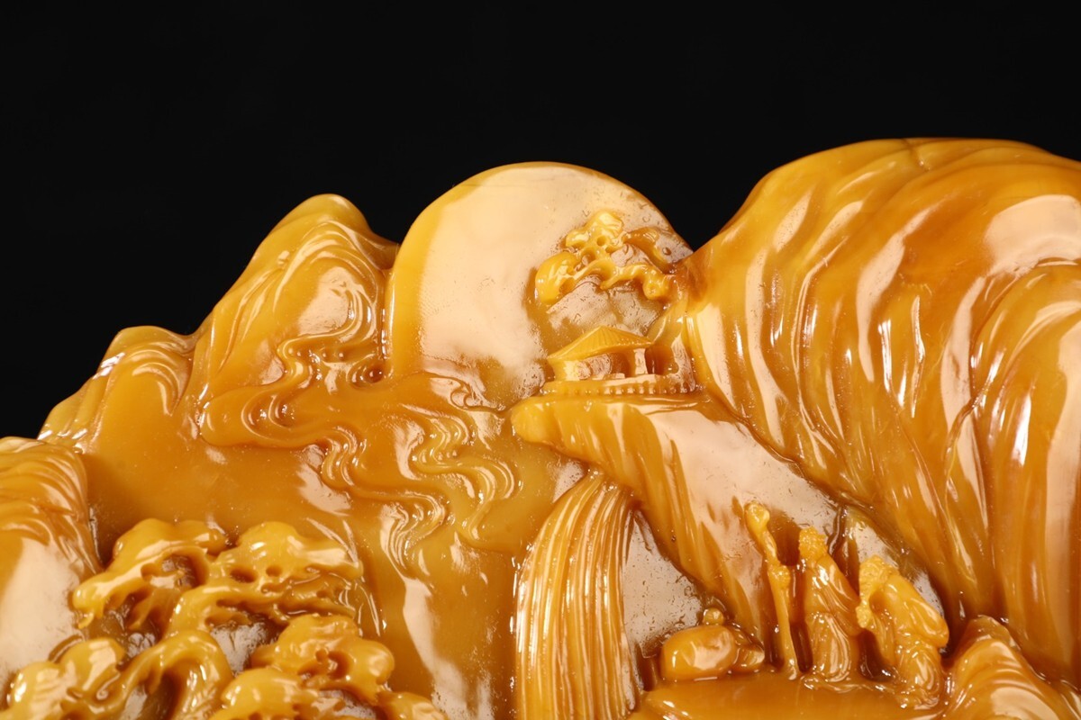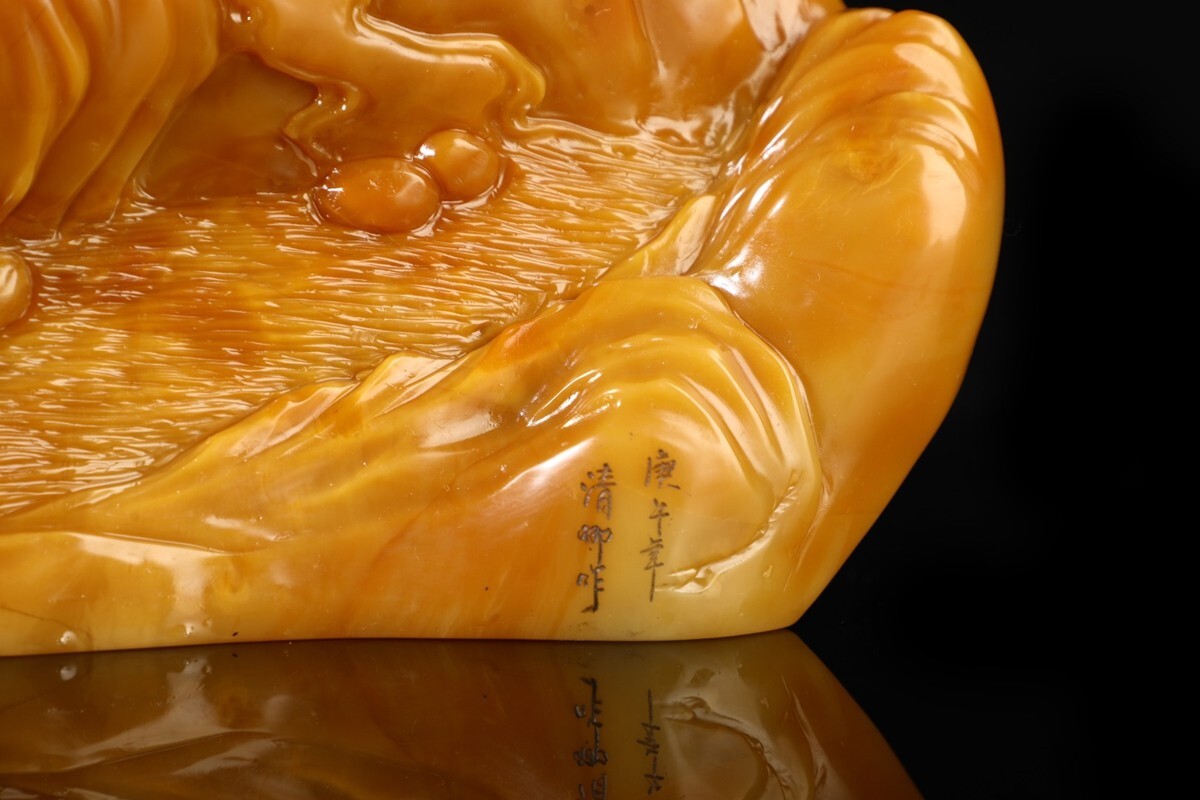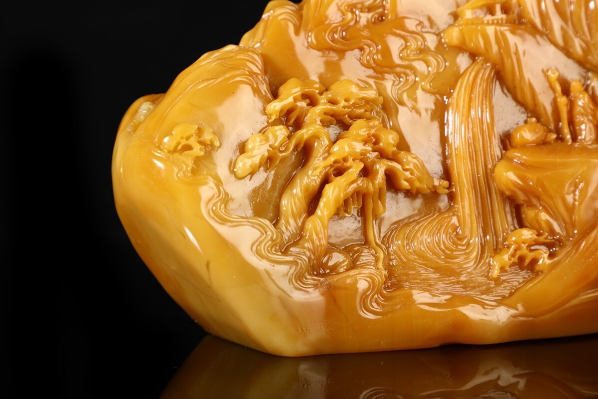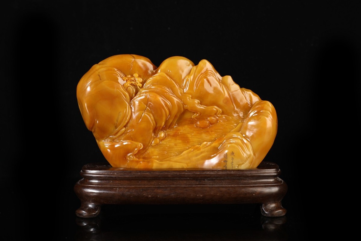 「清 清卿作 老寿山石 田黄石彫り 山水人物擺件」極細工 擺件 古賞物 中国古美術 旧蔵出