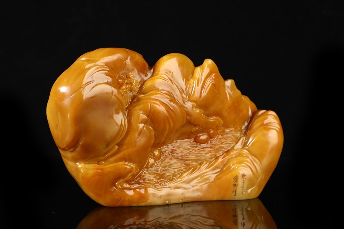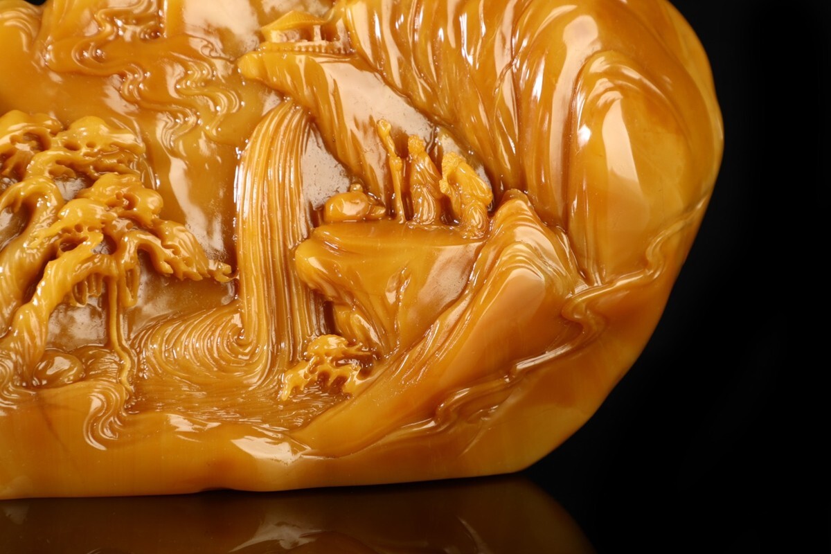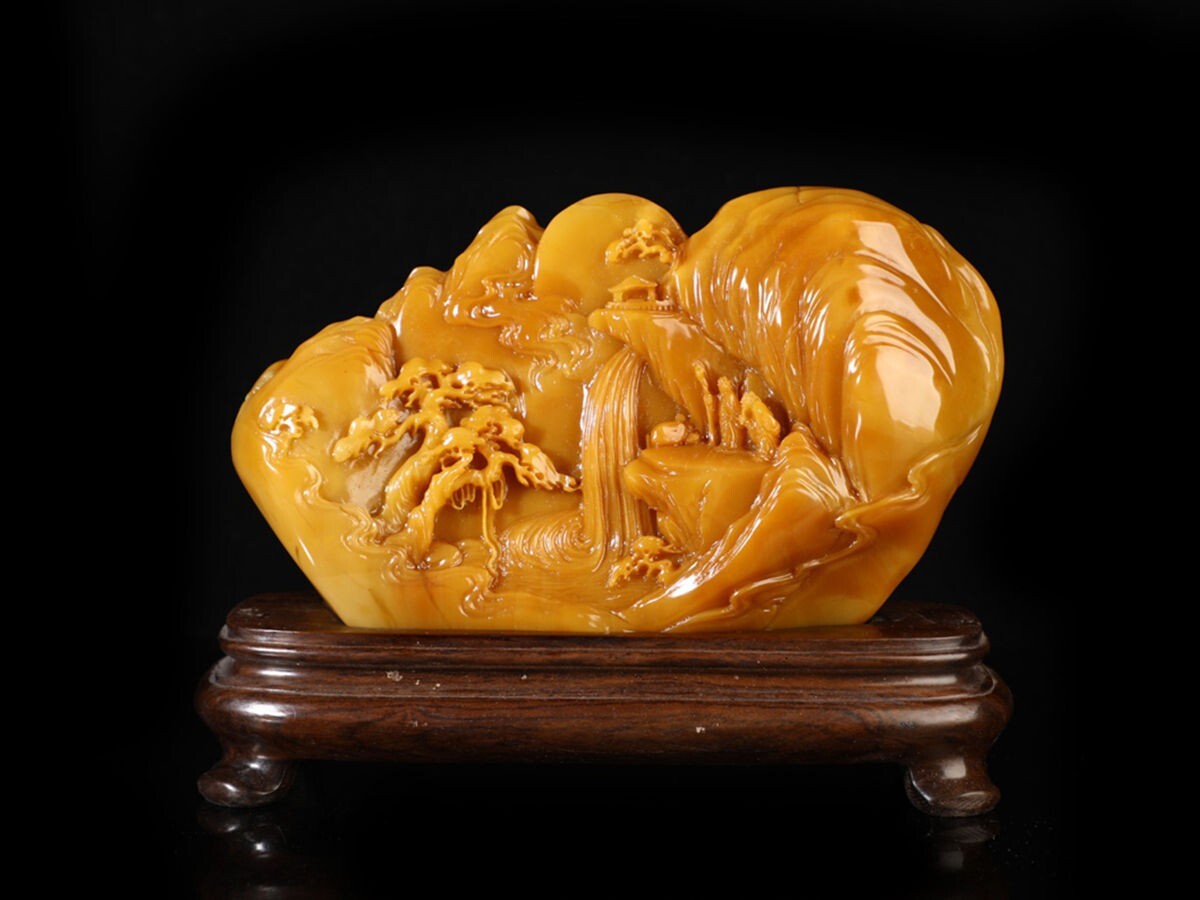 「清 清卿作 老寿山石 田黄石彫り 山水人物擺件」極細工 擺件 古賞物 中国古美術 旧蔵出