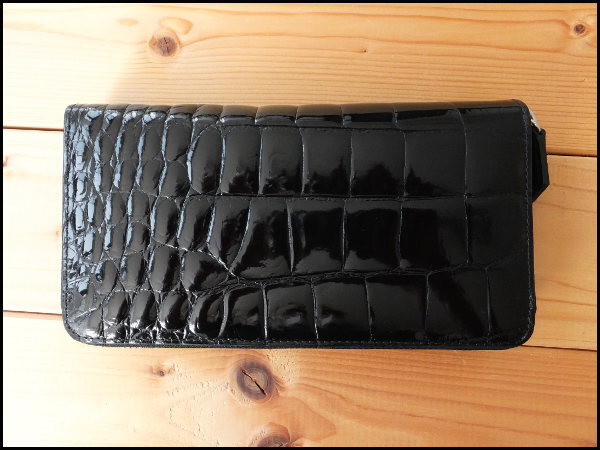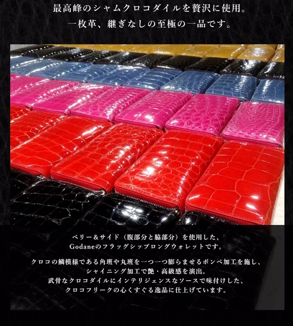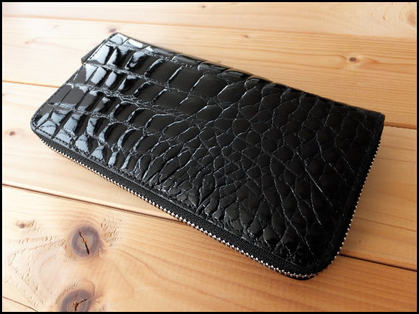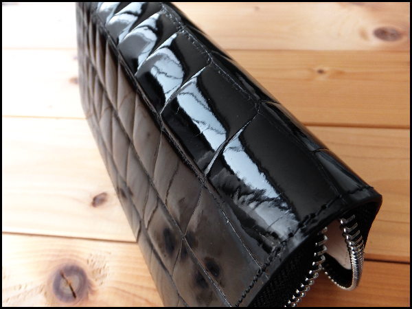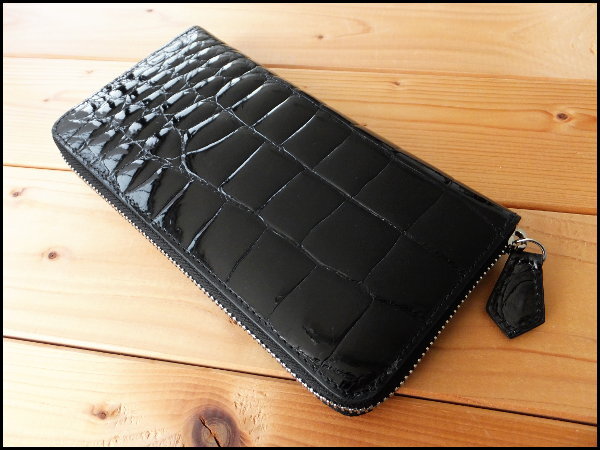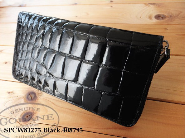 土日限定特価★ゴダン GODANE特注 美しい艶シャイニングクロコダイルベリー革 内側イタリア製ヌメ革 ラウンドジッパー 長財布 Black/795