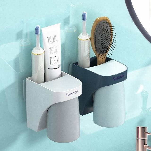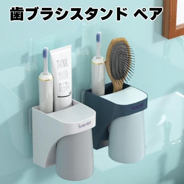 "歯ブラシスタンド(コップつき)ペア ?カラー:グレーと ブルー ?サイズ:12㎝×8㎝×12㎝ ?素材:ポリプロピレン 【早い乾燥】 この歯ブラシホルダーは、磁石の力でコップを吊り下げるように設計されており、コップに残された水が乾きやすいです。 【洗面台すっきり】 粘着パッドで壁に掛けられ、浮かせ収納することにより、洗面台がすっきり!洗面台を使う時の水沫等が歯ブラシやコップに飛ぶこともなく、衛生的です。 【取付簡単】 粘着パッドで取付でき、壁に穴を開けたり、くじを使ったりすることありません。粘着パッドの荷重力は約2.5kgです。"