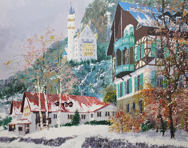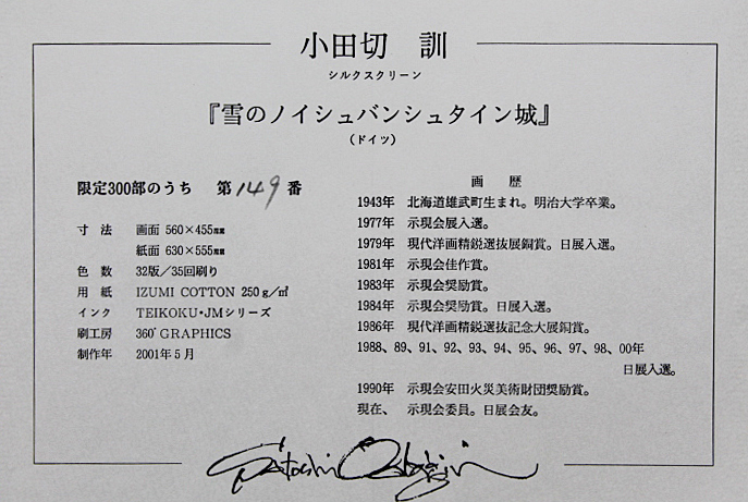 ■小田切訓 【雪のノイシュバンシュタイン城(ドイツ)】 シルクスクリーン 直筆サイン エディション有り 奥付有り