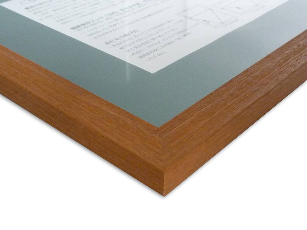 自然色の平角型の木製のポスターパネル。 前面の透明板は0.4mm厚のPETシートを使用しているため大幅な軽量化を実現。非常に割れにくいため安全性も向上。 紙製の裏板(段ボール)を使用。