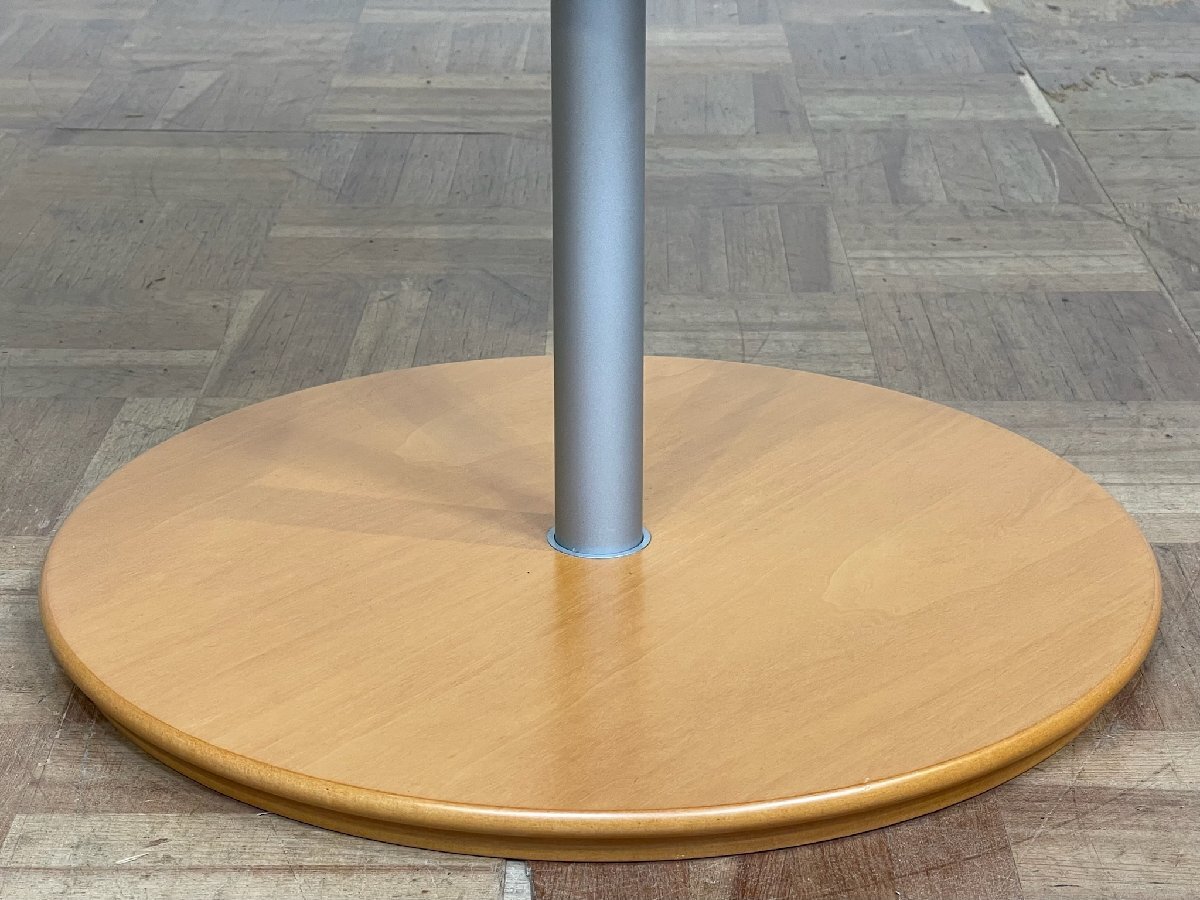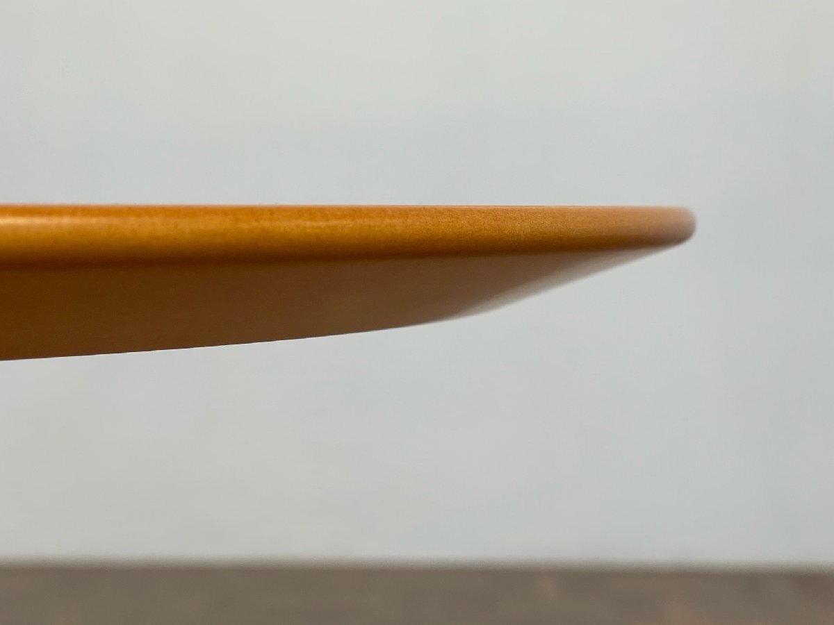 凛とした清楚な雰囲気とブラウンイエローの温かなカラーリング、台座と天板の緩やかなカッティングと、絶妙なバランスで設計されており、ほっそりした支柱の静かなシルバーが禅とした印象を鳴らしています。