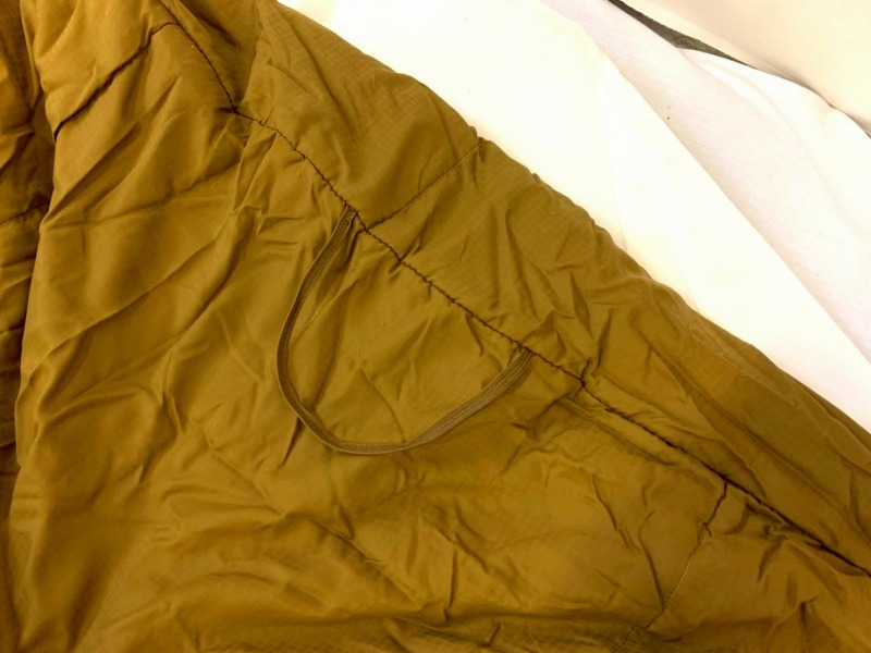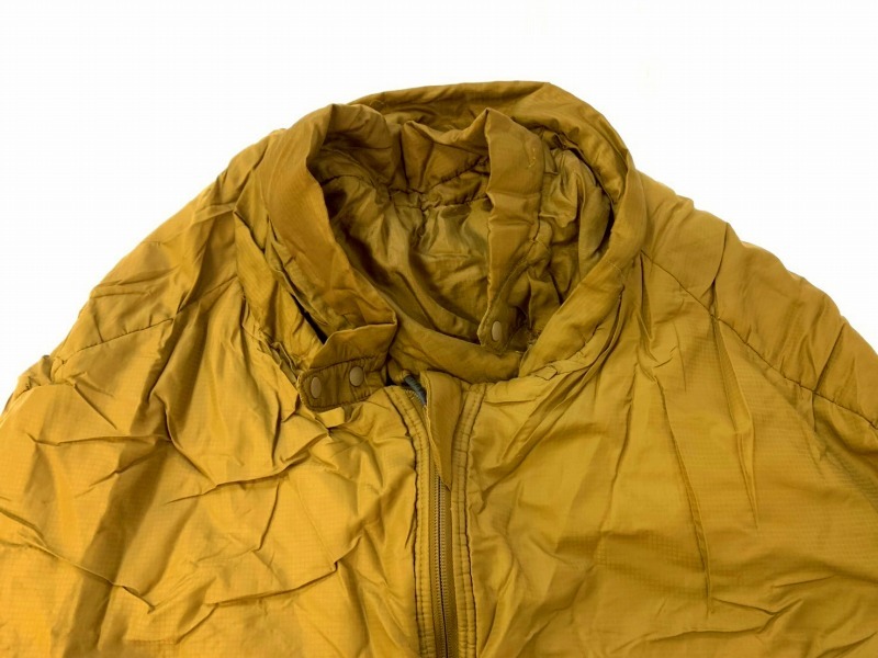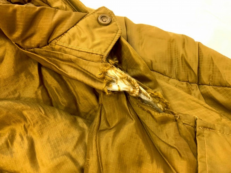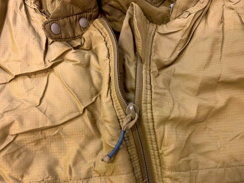 ☆ 開口部はドラフトカラーと呼ばれる二重構造となっており、ドローコードで顔の周りを絞った上で ドラフトバッフル(チンストラップ)でしっかり閉じる事ができます。出入りする時は腰部あたりまで大きく開くフロントジッパーで、内側から手で押し広げるだけでスライダーが下がるように非ロック性のファスナーとなっています。(※ 本品はスライダーが欠落しています)
