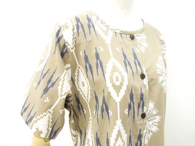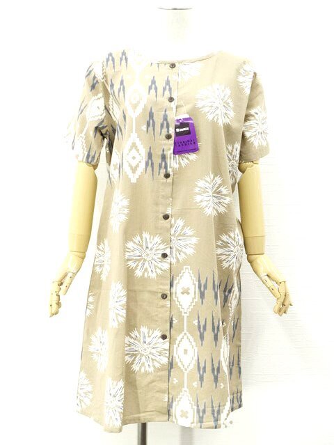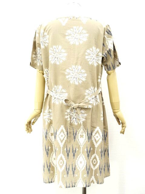 ひざ丈 半袖 ワンピース M-L ベージュ地 オフホワイト×グレー ネイティブ柄
