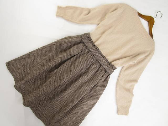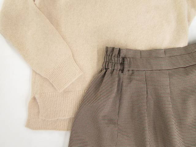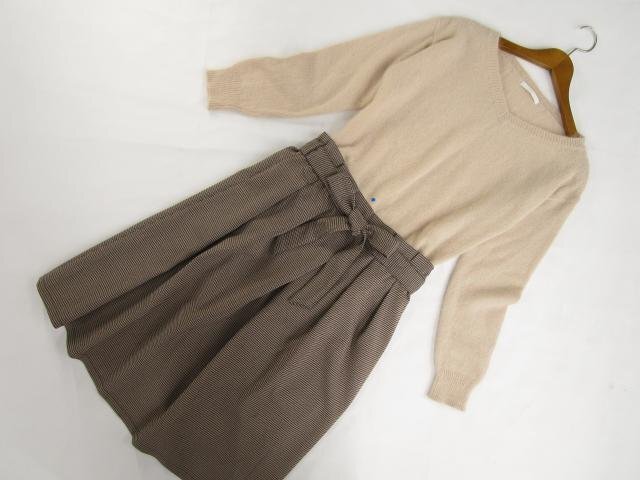 長袖ニットセーター+ひざ丈タックスカート コーディネート上下2点セット L相当 ベージュ/ボルドー×ブラック 千鳥格子柄 きれいめ