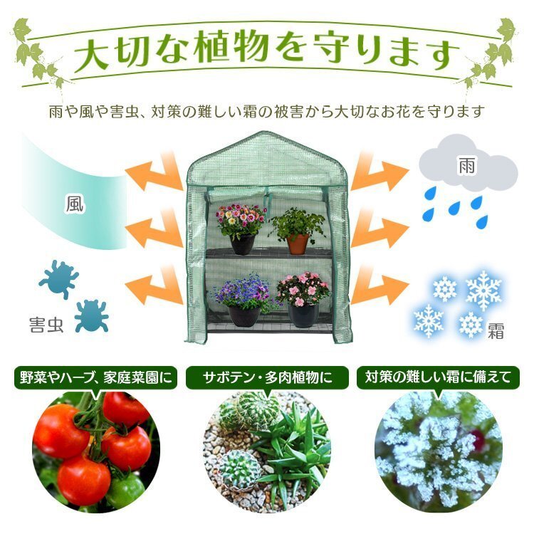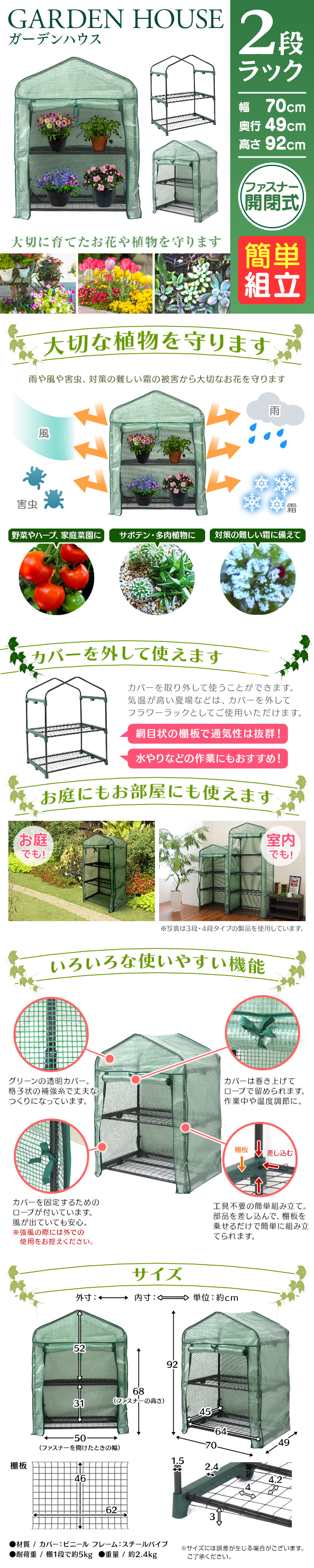 | 簡単に設置可能な2段用ガーデンハウスです。 あなたの大切なお花たちを風や雨からガーデンハウスが守ってくれます! お気に入りの植木鉢やシルクフラワーなどをセンスよく立体的にディスプレーできます。 ぜひ、お気に入りのお花たちをいっぱいならべてあなた独自の素敵な空間を作り上げてみませんか♪ 【商品詳細】 カラー ・グリーン(カバー) ・ブラック(棚) サイズ:(約)幅70cm×奥行き49cm×高さ92cm 重量:(約)2.4kg タイプ:2段 棚耐荷重:1段につき約5kg 素材:スチール、PVC 他 【もちろん新品未使用品です】 ▼検索キーワード ガーデンハウス 2段 4段 フラワースタンド ビニールカバー 簡易温室 フラワーハウス ガーデニングラック ビニールハウス 家庭用 温室 カーデニング ラック ハウス 冬 カバー 園芸 植物 ビニール 花だん 花壇 菜園 園芸温室 家庭菜園 雨よけ 霜よけ |