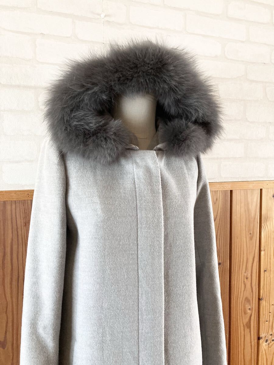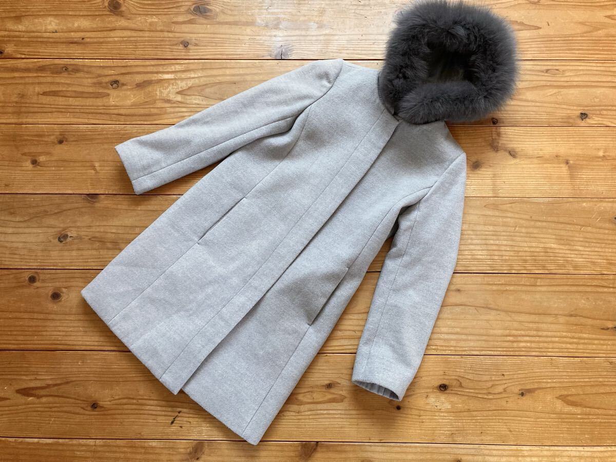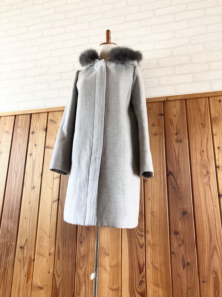 こちら、フード、ファー、共に取り外し可能、ブルーフォックスファーがデザインされたレディースコートです