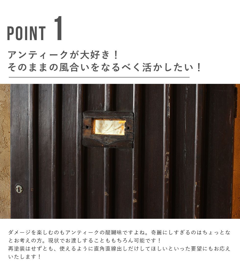 イギリス、フランスを中心にヨーロッパ中から直接買い付けをした本場のアンティーク品となります。 高級なイメージのアンティークですが、当店ではリーズナブルにアンティークをお楽しみい頂けるよう、ステンドグラスは一度に1,000枚以上。アンティークドアも100枚以上を一度に輸入。 全国でも有数の買い付け量を誇ります。 創業以来現在の買い付け量を保つ事で、現地ディーラーとの密な信頼関係を構築。当社に向けてより良い物を提供してもらえる環境作りを維持し、現在では現地取引先約20社と提携しています。 また当店ではアンティークのプロフェッショナルが常駐する工房を完備。修理、メンテナンスはもちろん、ステンドグラス、ドアの制作からカスタムまで、アンティークのご相談はウェリントンにお任せください。 ネットに載っていない商品もまだまだございます。京都伏見のショールームにも是非お越しくださいませ。 ※修理に関するご注意※ ■ 標準修理に関しては別途料金にて承ります。事前に仕上がりサイズを必ずご確認くださいませ。 ■ 標準修理をご依頼の場合、決済確認後の着手となります。恐れ入りますが代引きでのご決済はお断りしております。 |