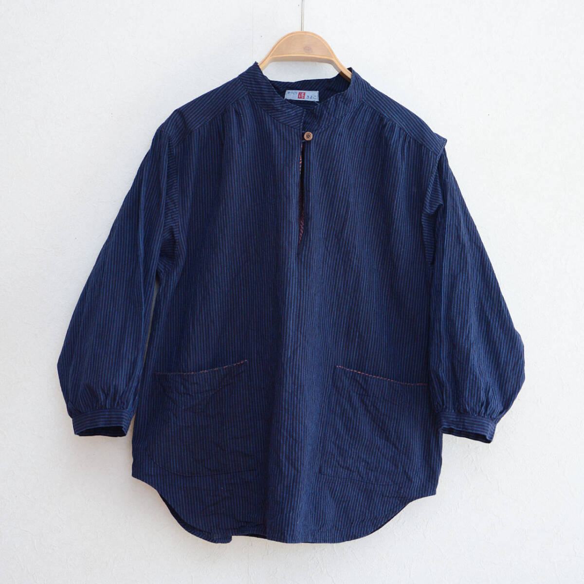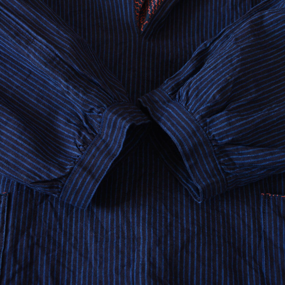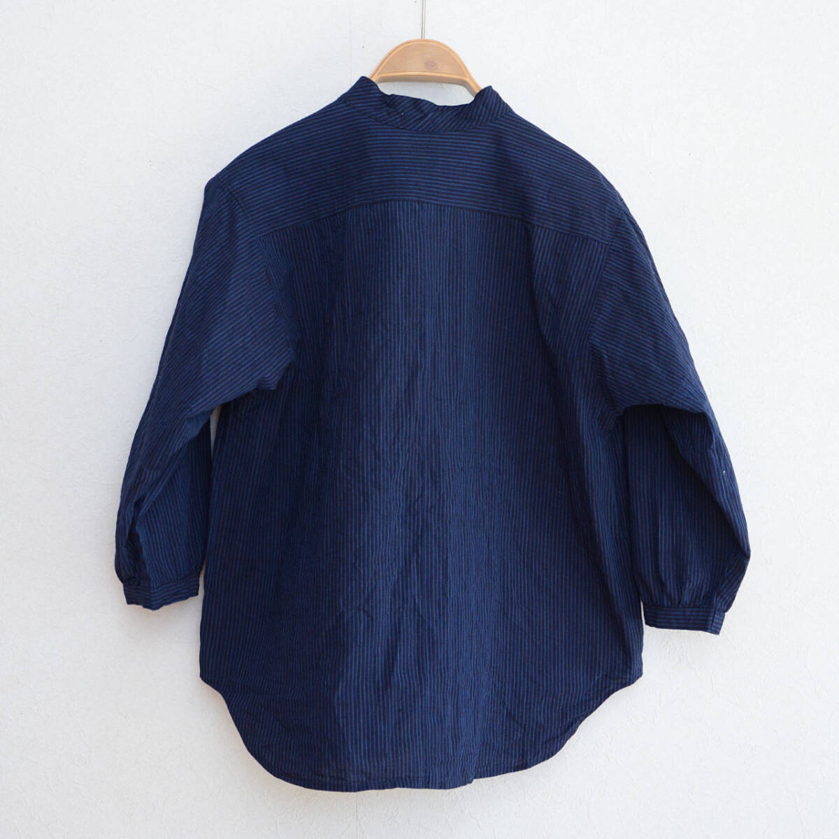 手づくりきよこ 木綿 縞模様 ブラウス|刺し子のマチ付きバンドカラーシャツ