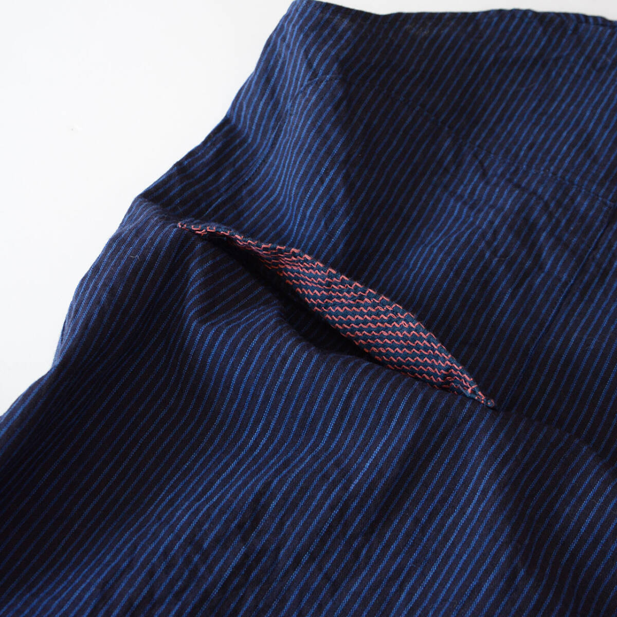 裾には両側にポケットが付き、ポケットの入り口の裏にも同じ刺し子生地があしらわれています。