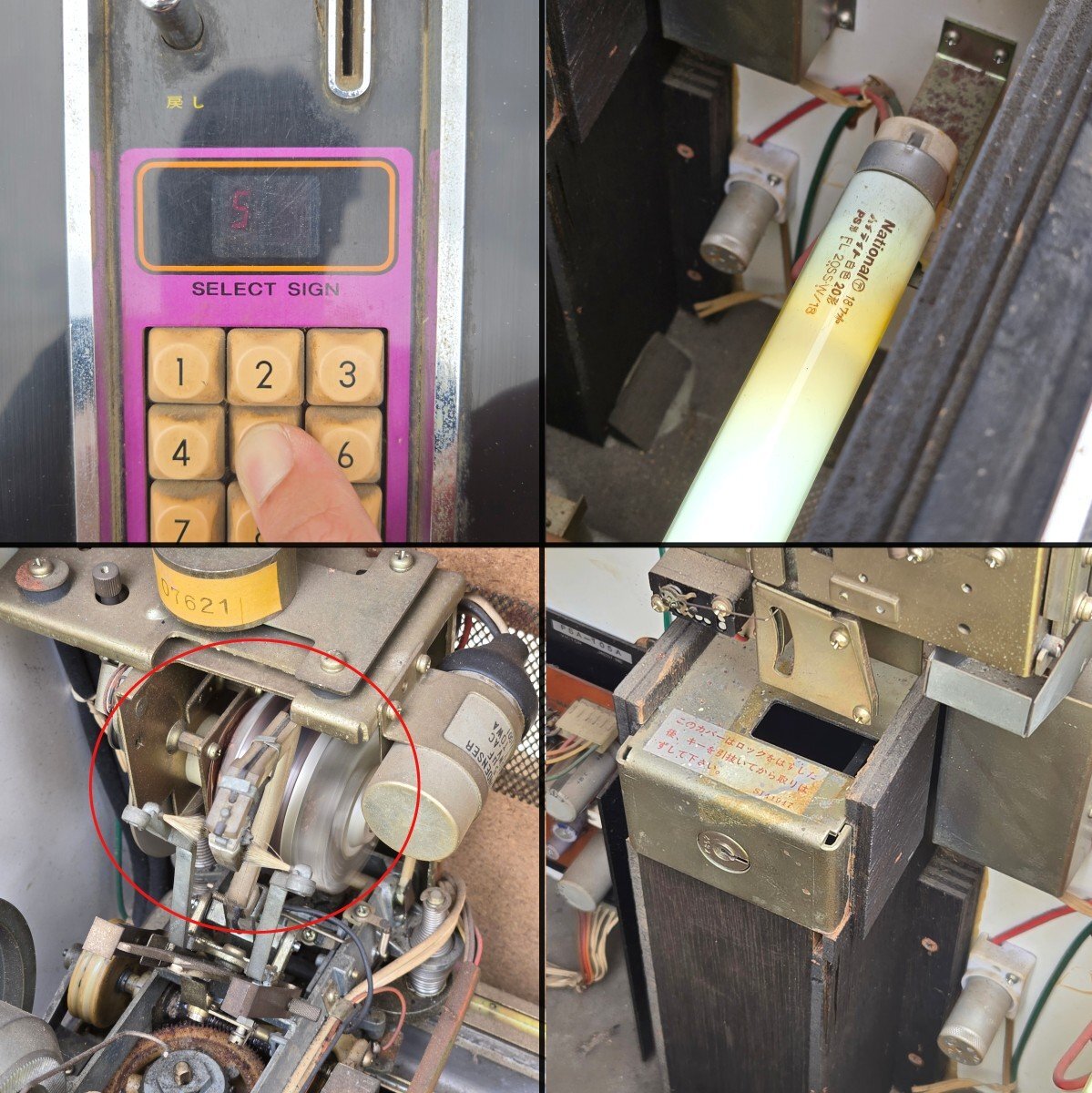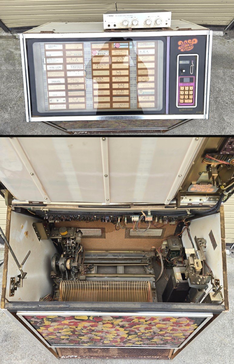 Victorのジュークボックスが入荷致しました。 傷や汚れなどの中古の使用感が全体的に見られ、 特に木材部分の劣化が進んでいます。 蛍光灯の点灯と、一部モーターの回転は確認できましたが、 レコード選択ボタンの接触が悪くなっており、 レコードの取り出し・再生の動作は確認できませんでした。 また、鍵が付属しておらず、コインボックスが開きません。 修理や部品取り前提のジャンク品としての出品となりますので、 ご了承の上、ご入札ください。 付属品はレコード盤12枚と、取り扱い説明書になります。 詳しい商品状態・仕様につきましては写真よりご確認下さい。 この機会に是非ご検討宜しくお願い致します。 【当アメNETでは】 出品する際の工具や業務用品、他の商品におきまして、清掃(吹き上げ)や動作確認をおこなっておりますが、 骨董・アンティークに関しては雰囲気を損なわないよう、最小限の清掃に留まらせて頂いております。 |