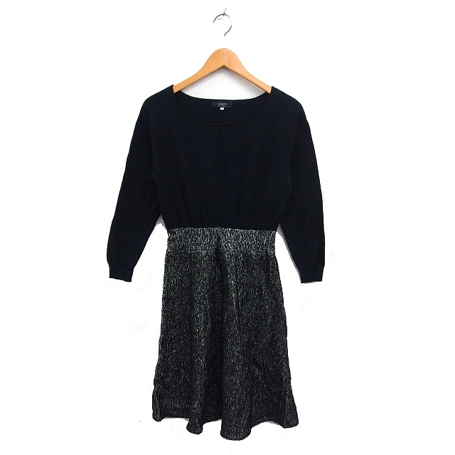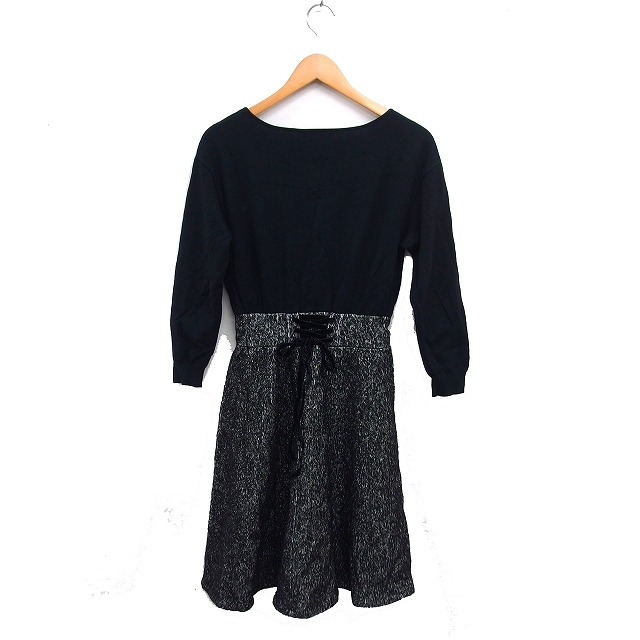 ジャスグリッティー JUSGLITTY ツイード フレア ワンピース ロング レースアップ ボートネック ニット 長袖 2 黒 ブラック /NT21