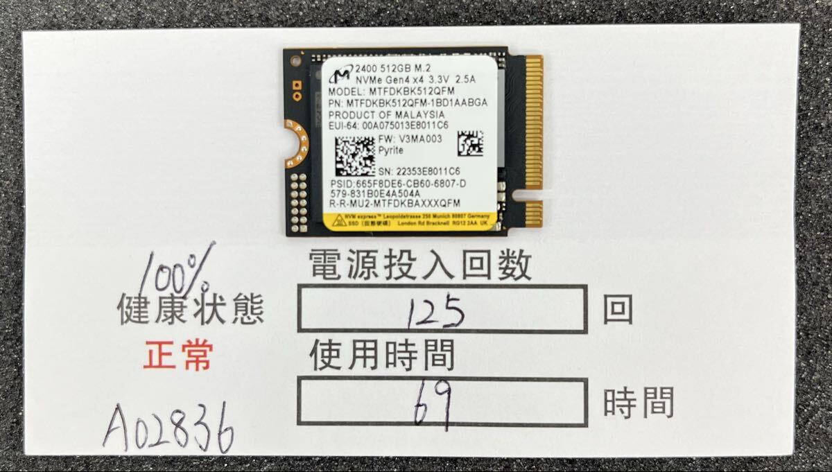 A02836/中古品/SSD/NVME/2230/Micron/512GB/動作確認済み/返品返金対応/納品書発行可(商品説明文ご確認下さい)