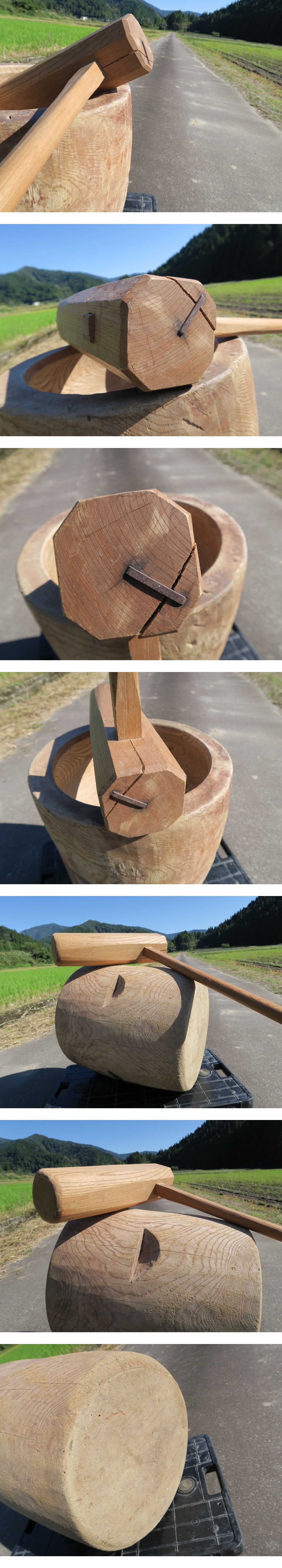 【室町】太鼓型 臼と杵 ケヤキ製 約2~3升つき 【寸法】 (臼) ・外径:約41.5㎝ ・高さ:約45.5㎝ ・内径:約33㎝ ・穴の深さ:約18㎝ ・重量:約50kg (杵) ・柄の長さ:約82㎝ ・頭長さ:約42.2㎝ ・頭径:約10㎝ ・重量:約3.4㎏ 一度に2~3升つき(25~35個位)はおつきになれます。 数値はおおよその目安になります。若干の誤差は御了承ください。 杵には画像のように、口縁に割れが御座いますが使用には問題御座いません。その他、経年による擦れ等はご承知ください。 | ||||||||