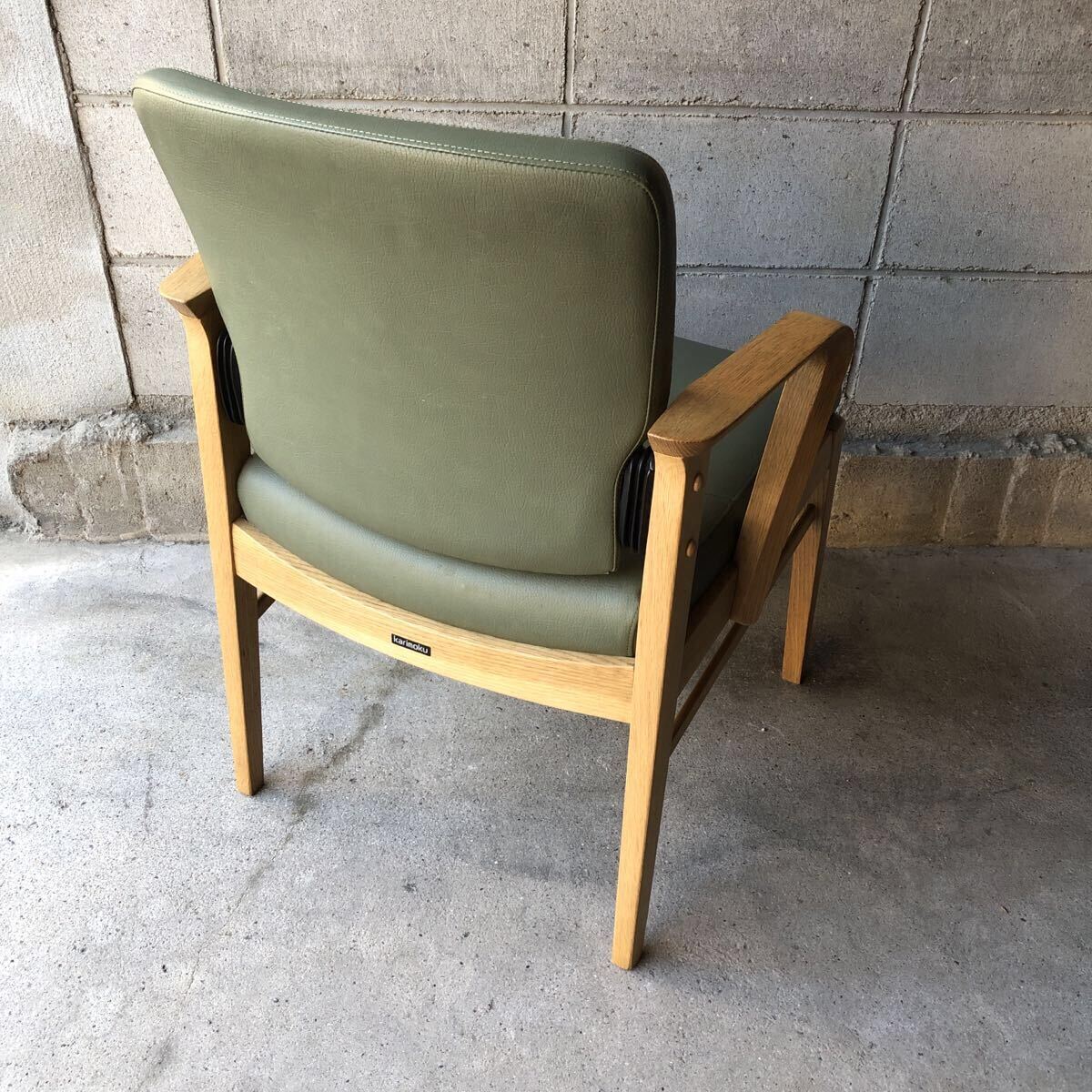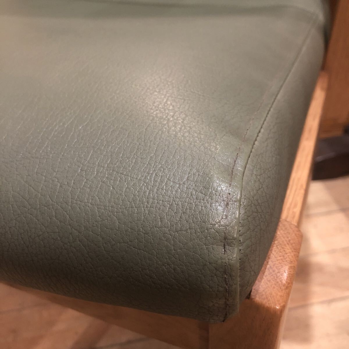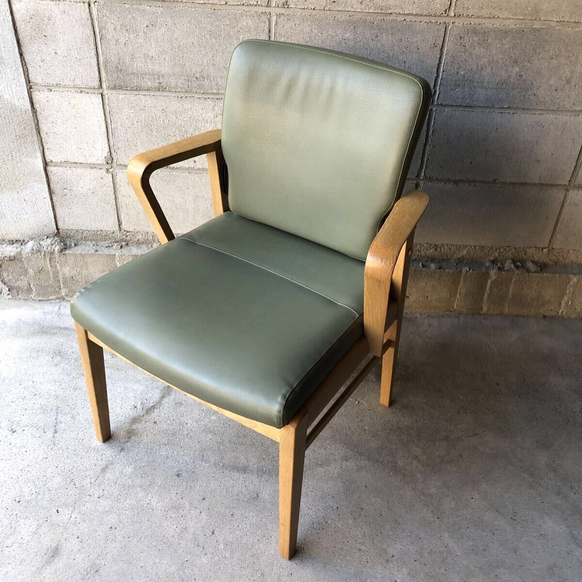 落ち着いたペールグリーン色の肘付きが浅いチェアです。肘付きが立ち上がりをサポートしてくれます。