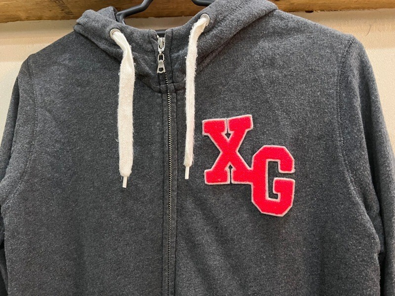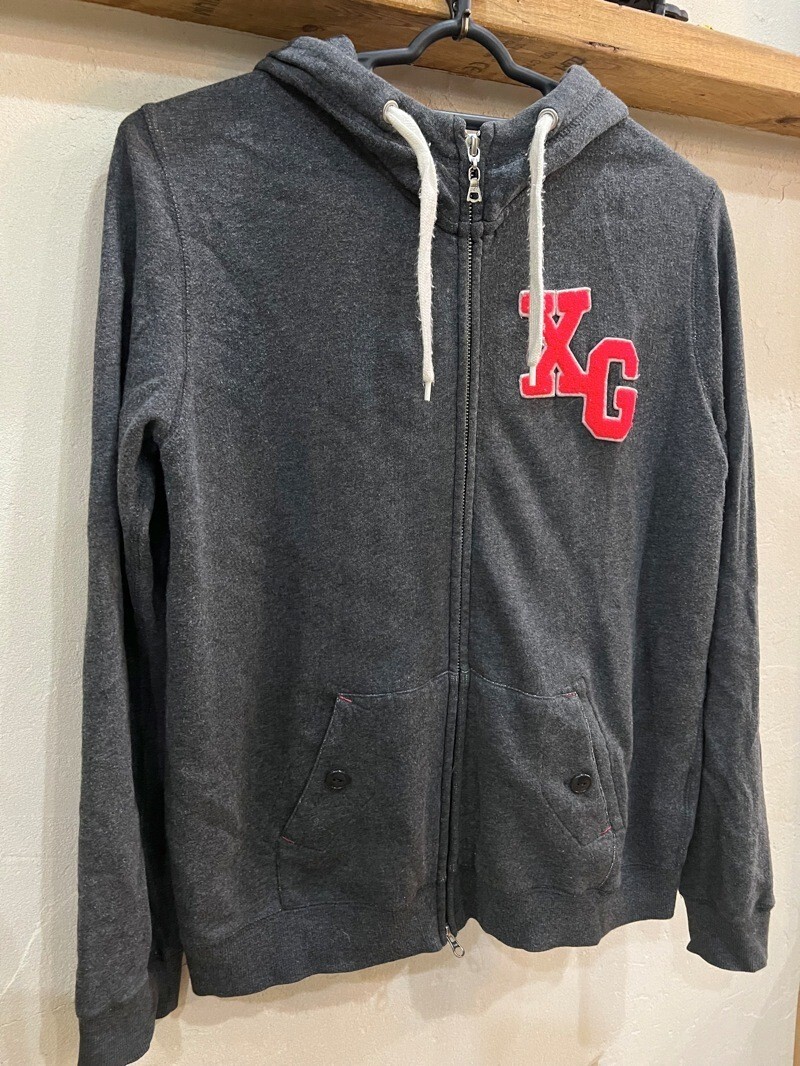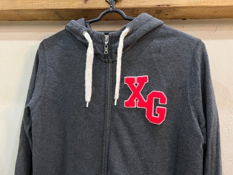 N32★X-girl/エックスガール ワッペンデザインフーディーパーカー グレー×ピンクロゴ レディース サイズ2(Lサイズ程度) カジュアル★