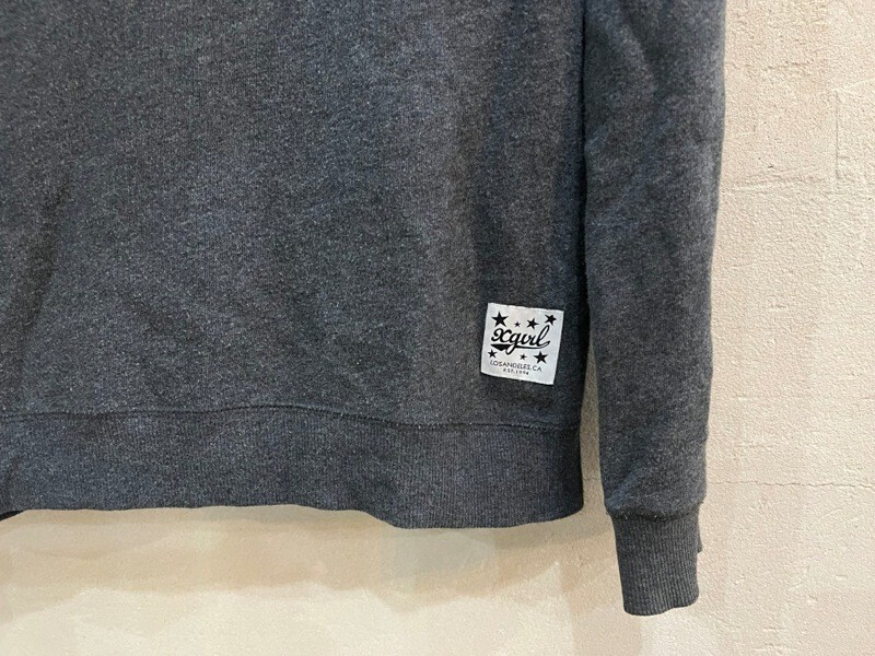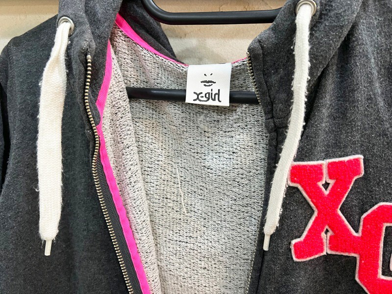 X-girl/エックスガール ワッペンデザインフーディーパーカー グレー×ピンクロゴ レディース