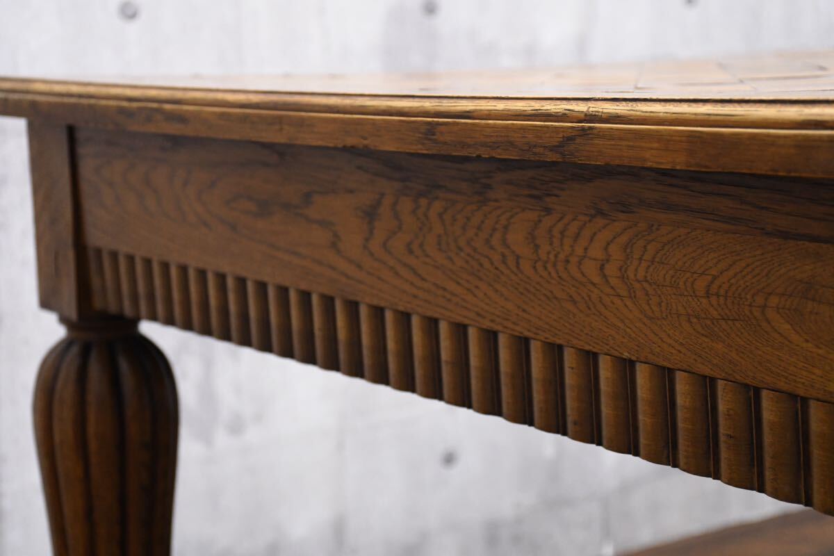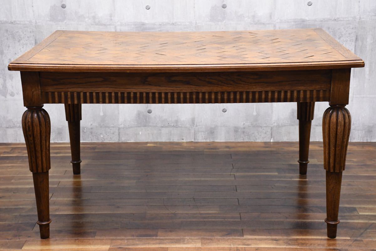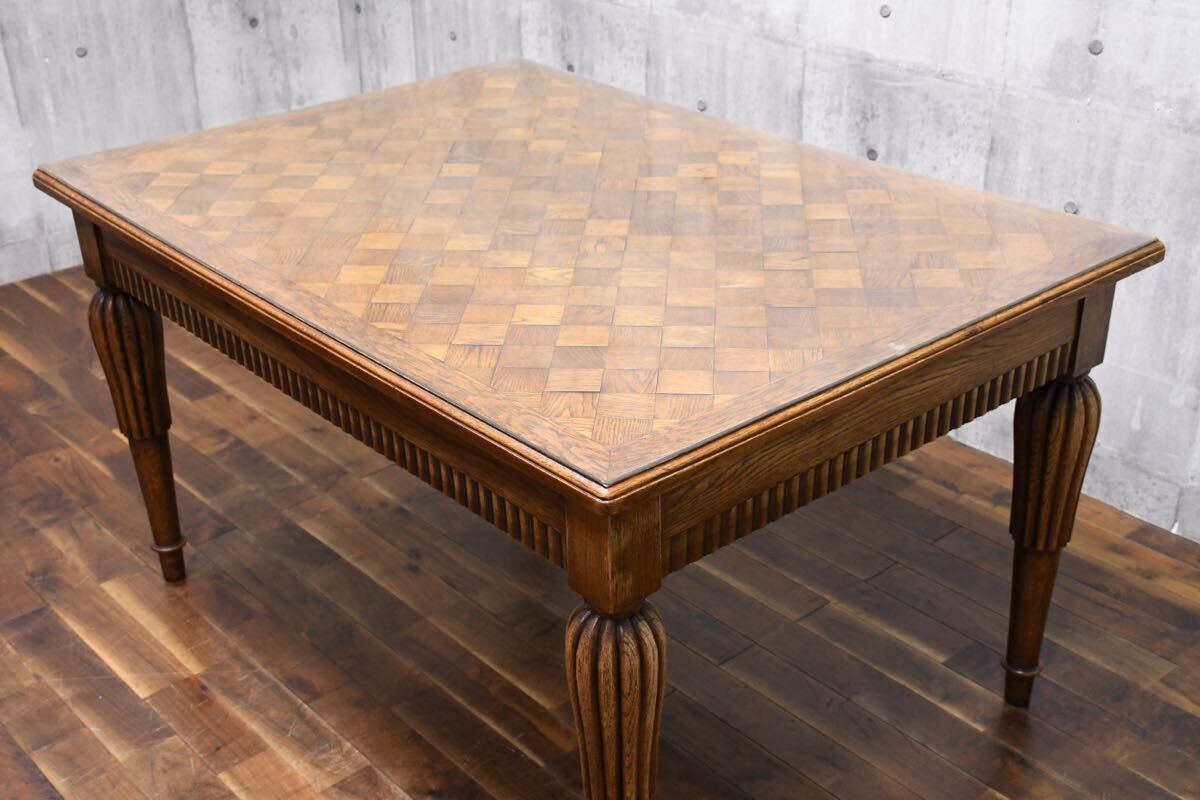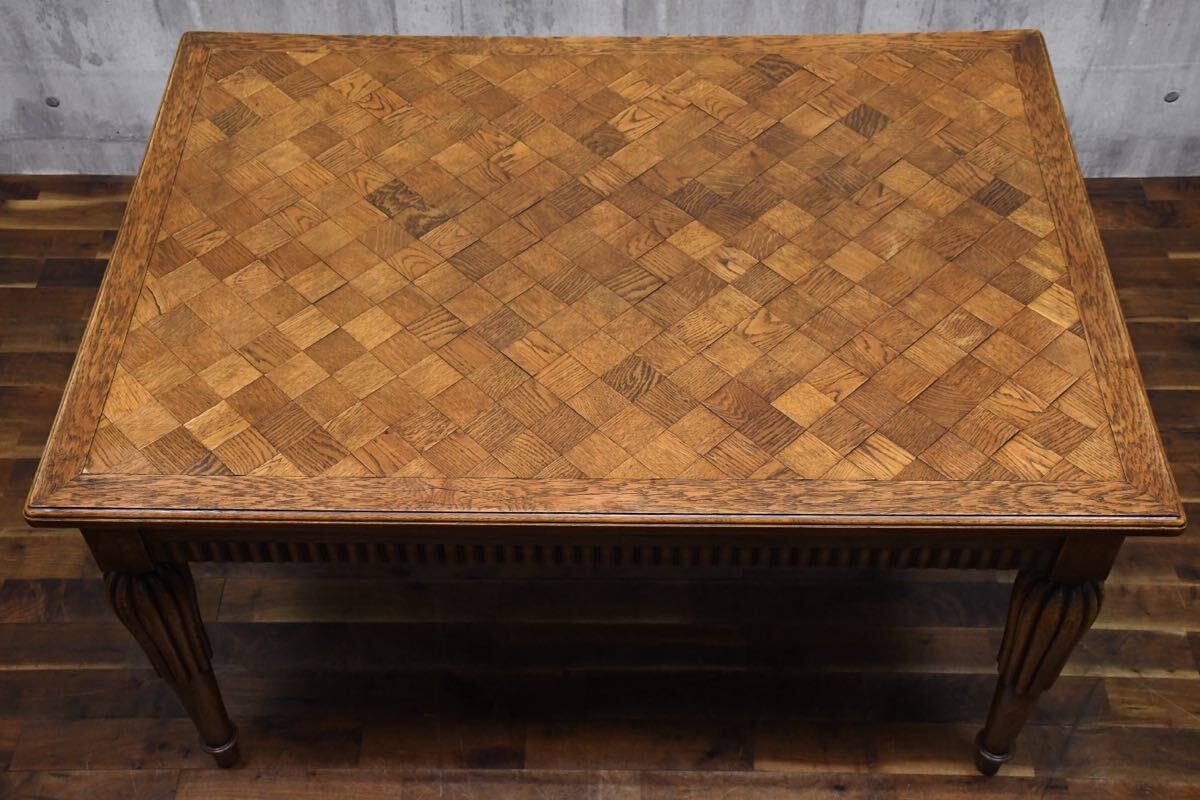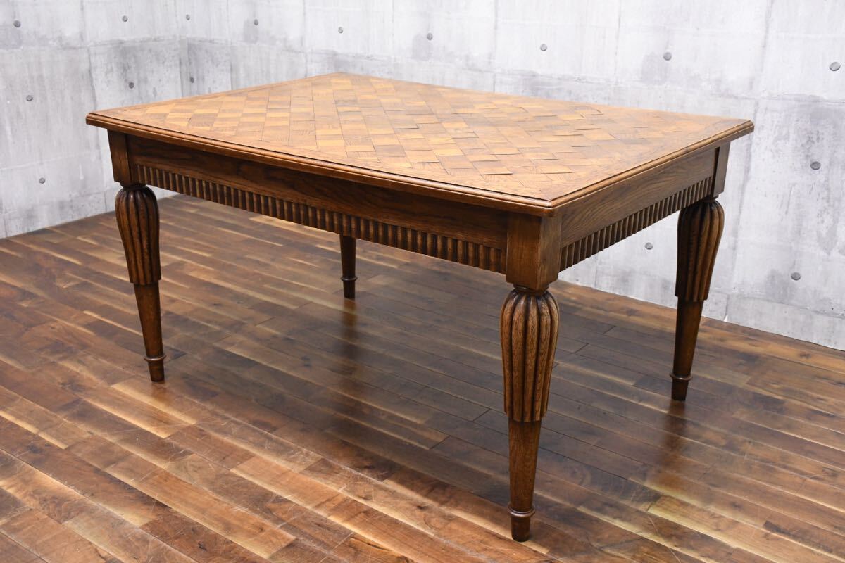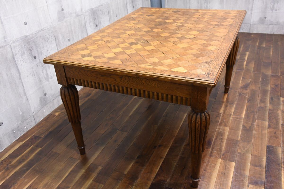 英国アンティーク アールヌーボー様式 ダイニングテーブル オーク材 モザイク寄木細工 食卓テーブルの出品です。