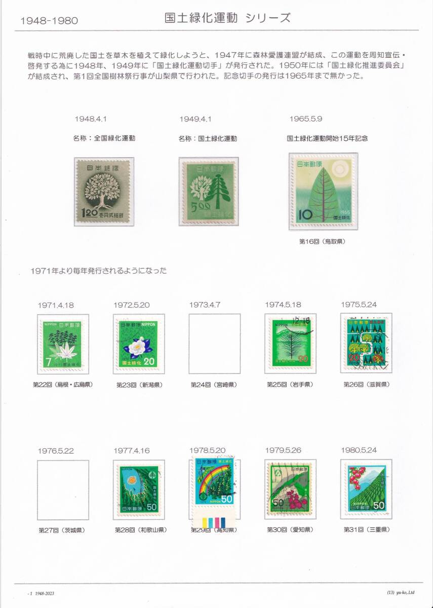 | 内容:1948年から発行された 「国土緑化運動」シリーズ切手を納める事が出来るリーフ(台紙)です。 【 特徴 】 ・ 各切手には、整理、鑑賞を深めるための絵柄説明が入っています。 ・10ページで、2023年発行分までの全種が整理出来ます。 2008年からの「ふるさと切手」としての発行分も、このシリーズの変化に合わせてリーフを製作しまとめて ありますので大層見やすいかと思います。