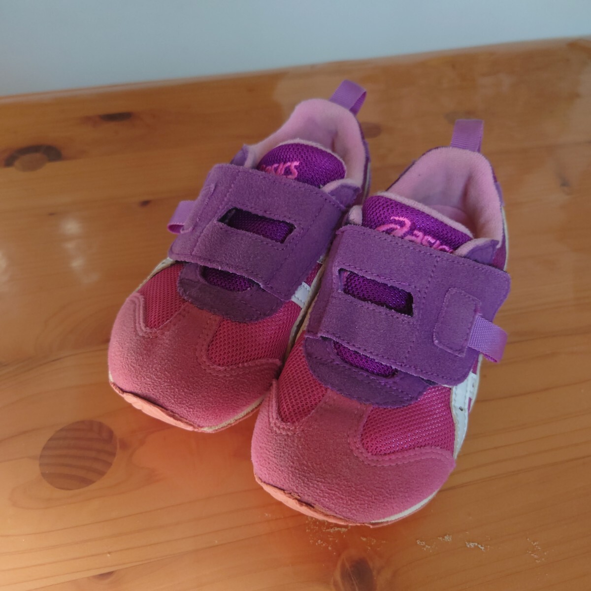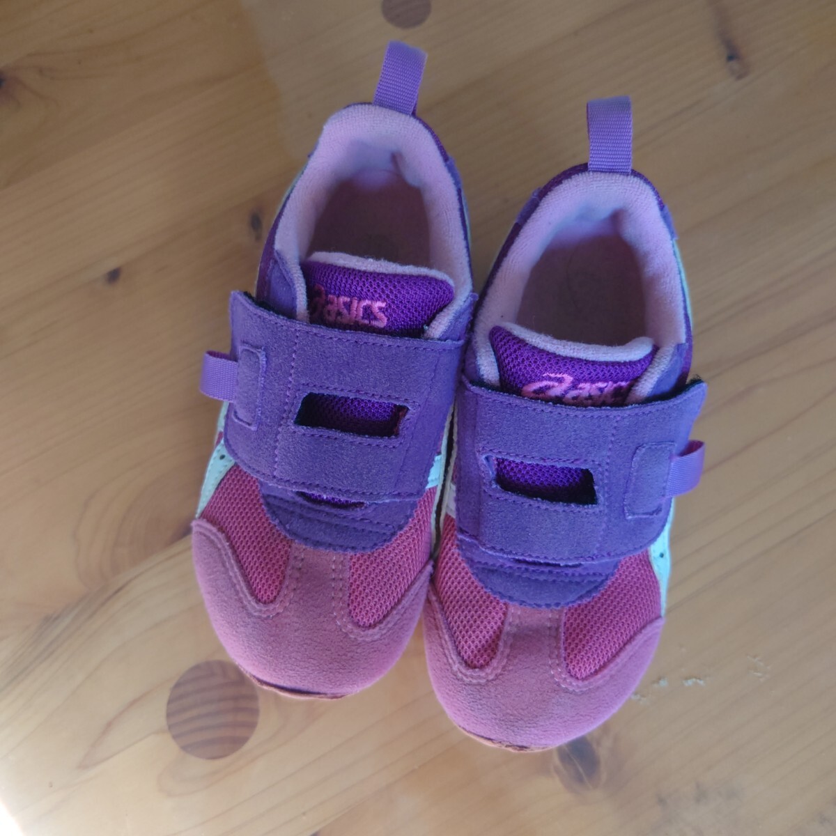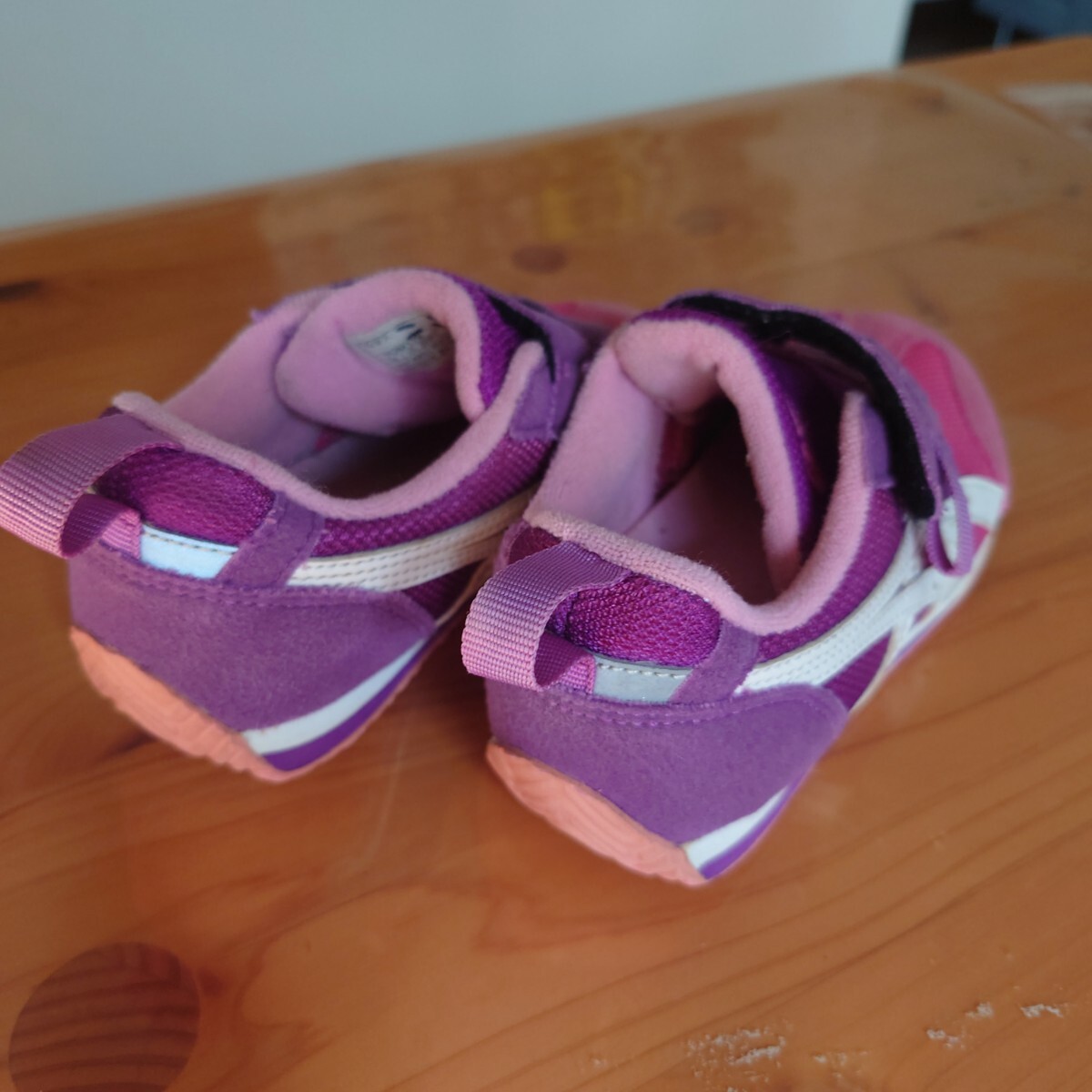 ベルクロ留めのデザインで、16cmのピンクと紫のスニーカー。