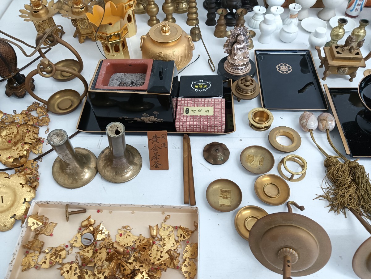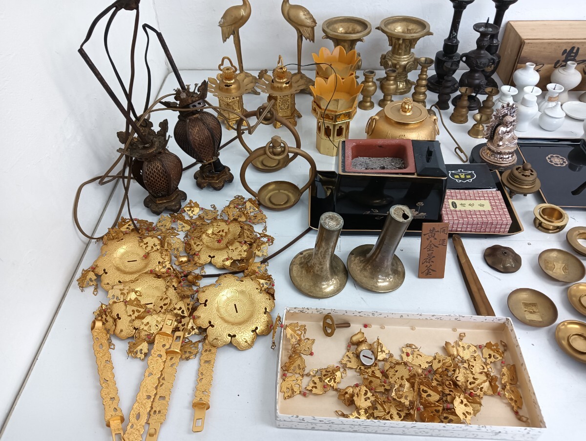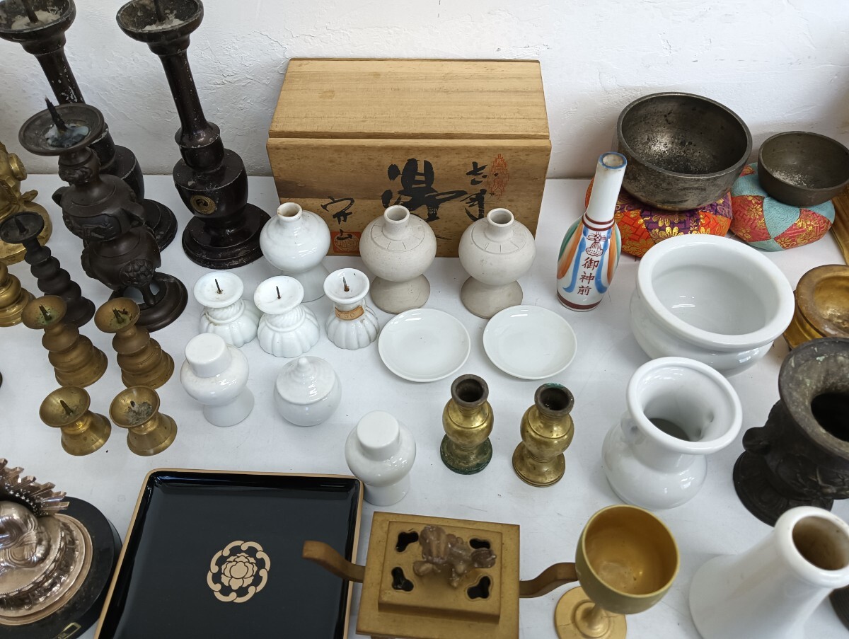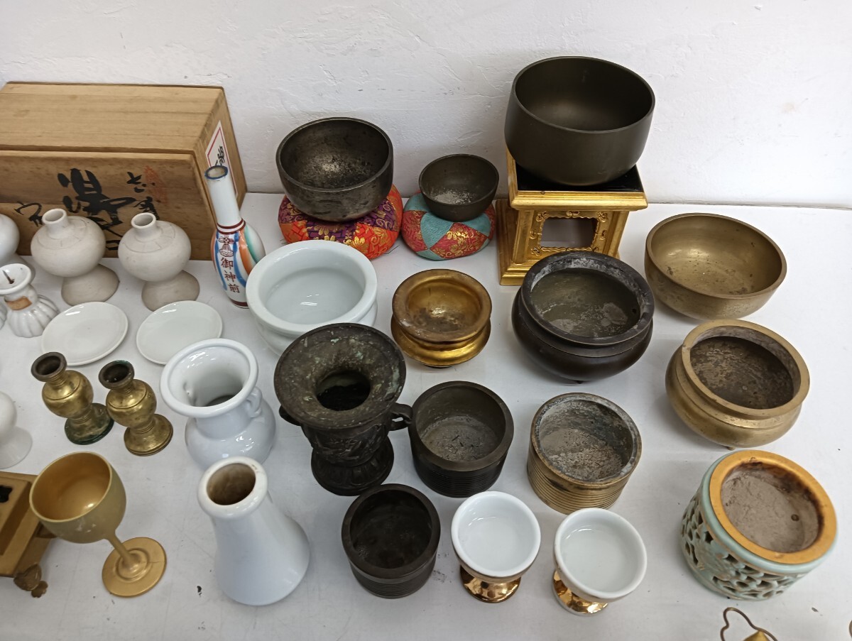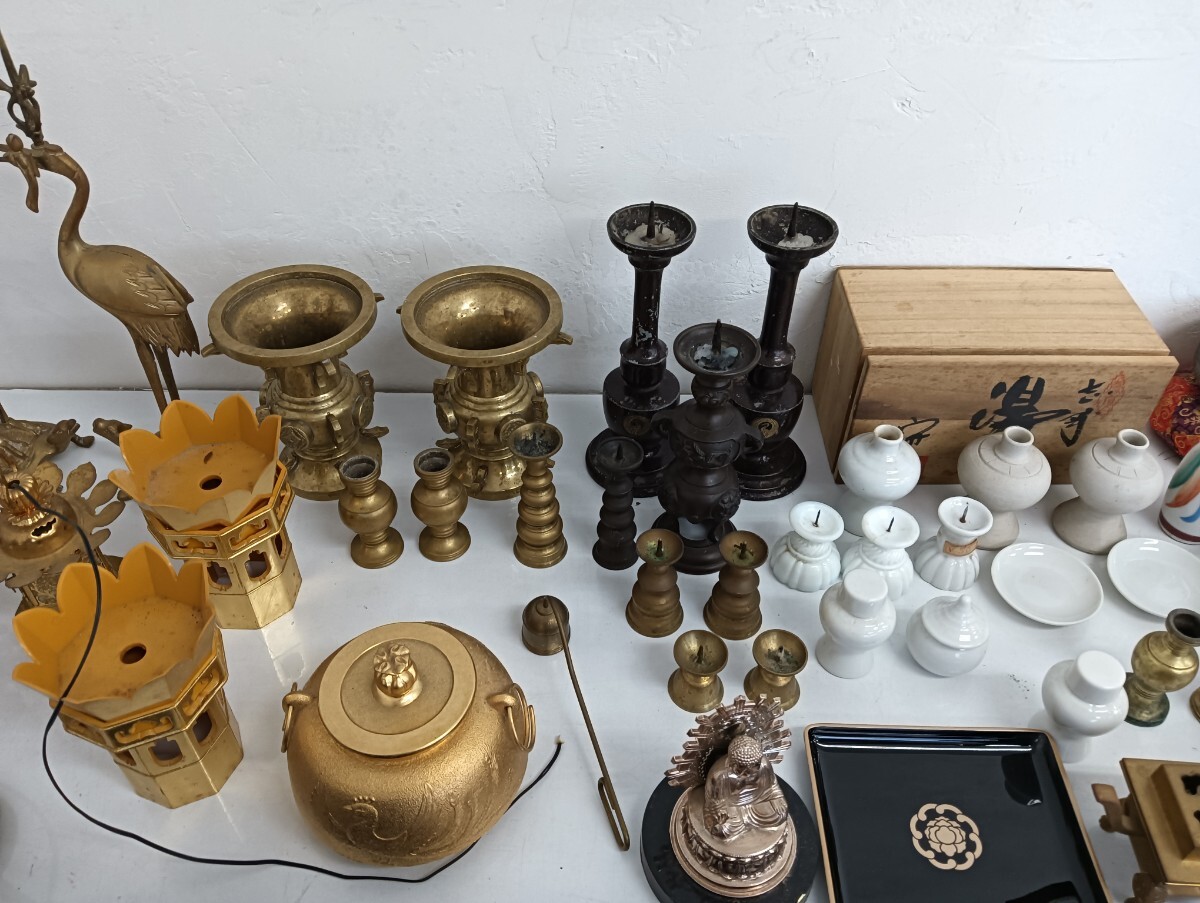【25*11002】◆仏具おまとめ売り◆ロウソク立て/おりん/花立て/焼香セット/鶴亀燭台/鳳凰の模様が施された金色の香炉他/仏飯器◆骨董品 | |||