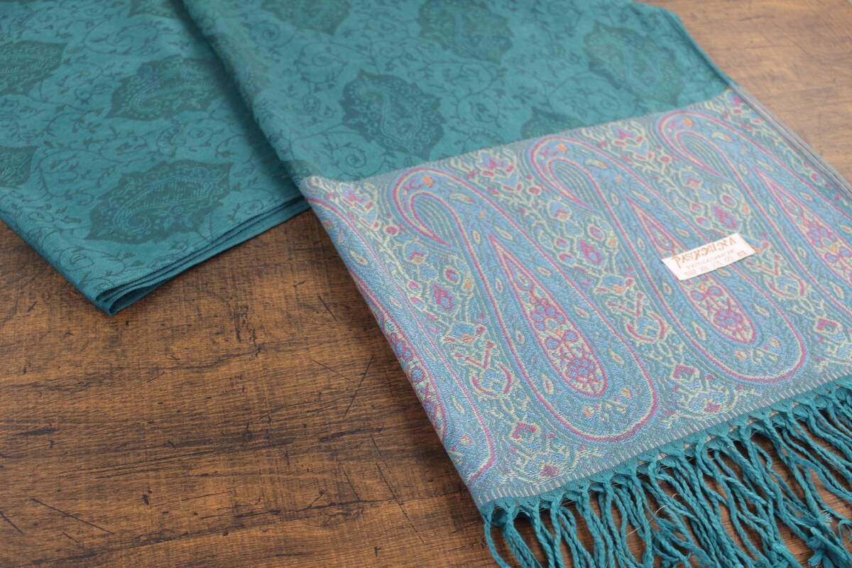 新品【パシュミナ Pashmina】ペイズリー×ツタ柄 エメラルドグリーン系マルチカラー 緑 E.GREEN 大判 ストール カシミア100% Cashmere